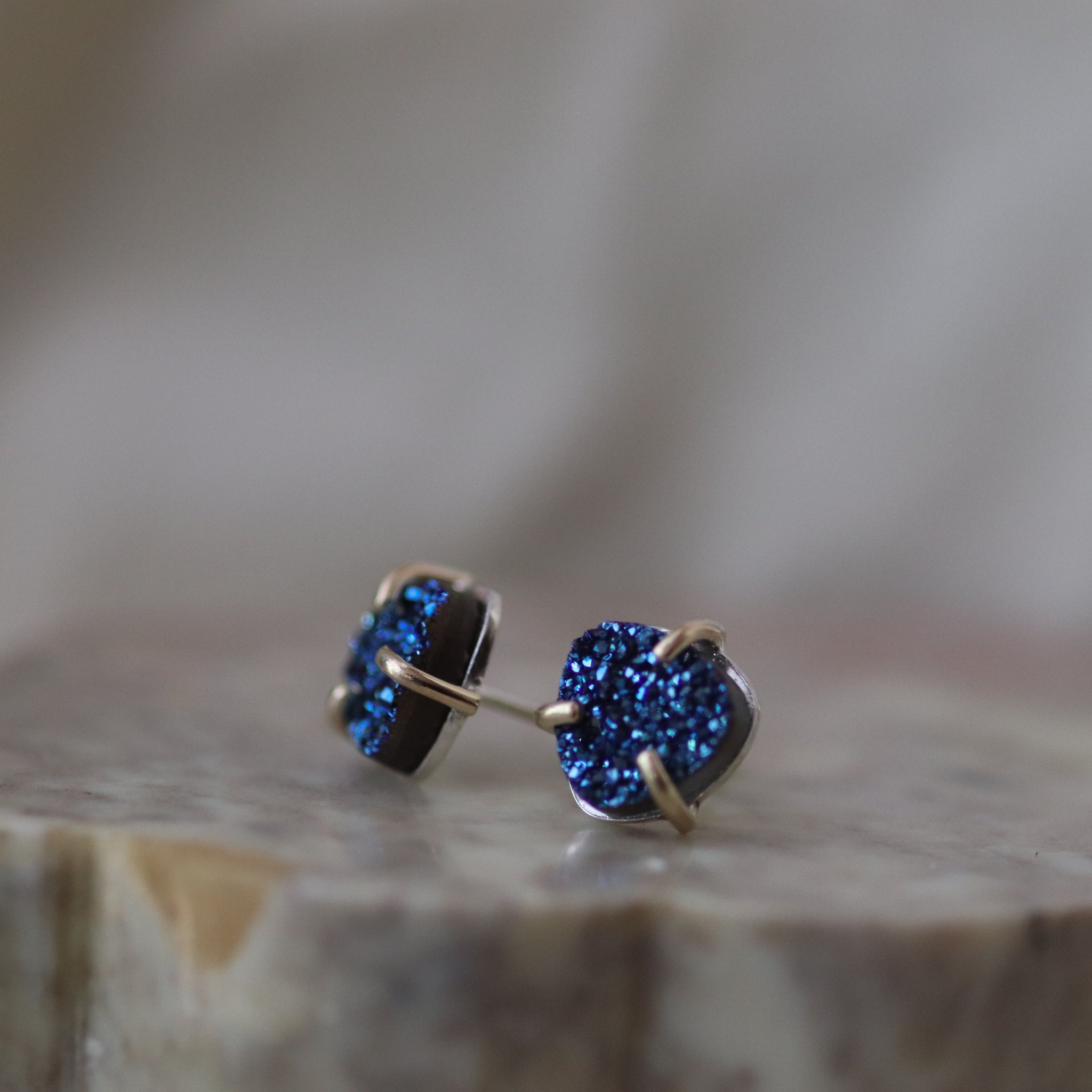Dive into bold island beauty with these stunning cobalt blue druzy earrings. Like sunlight hitting deep tropical waters, these crystals shimmer with electric blue energy—radiant and full of coastal magic, with 14k yellow gold prongs on sterling silver.