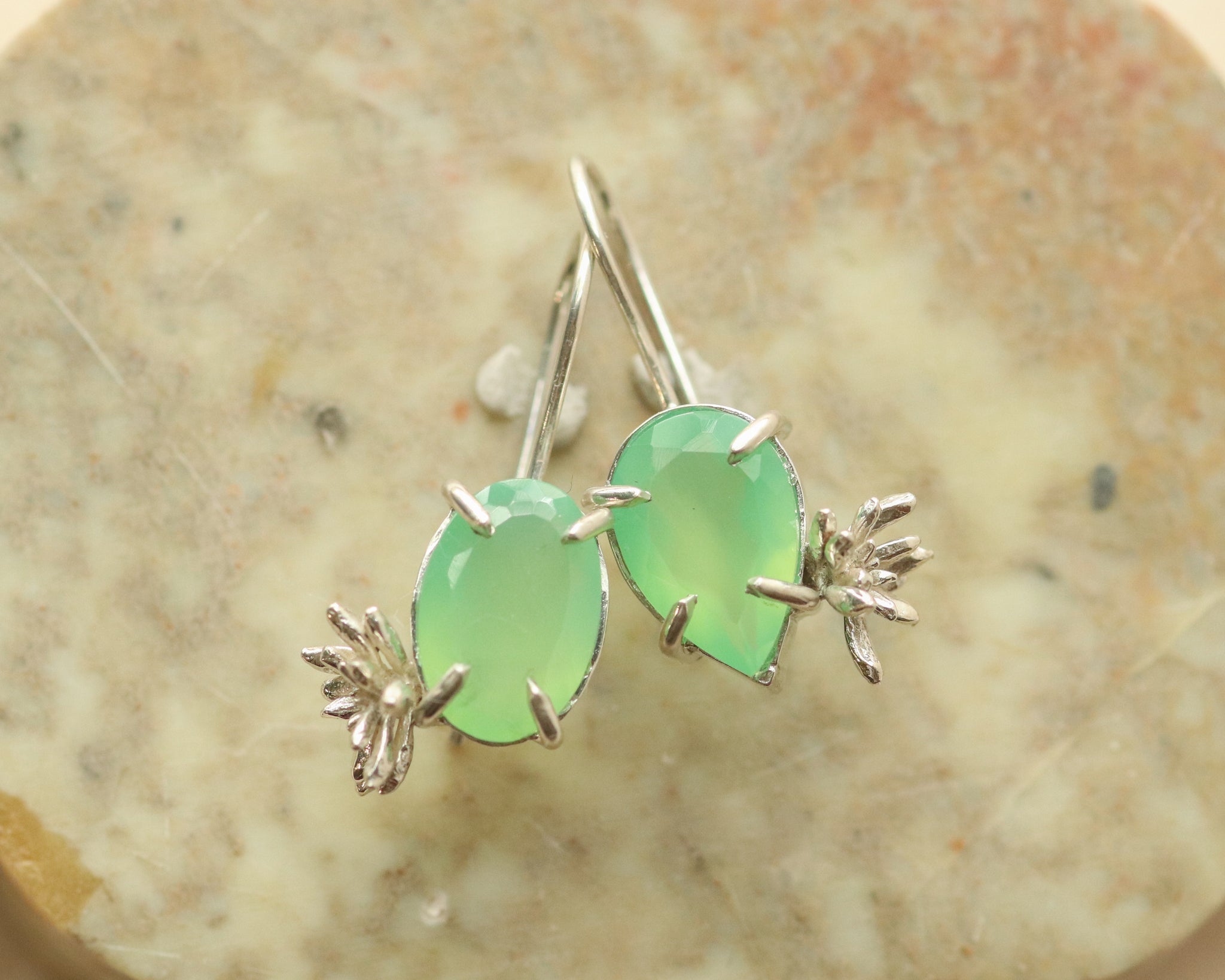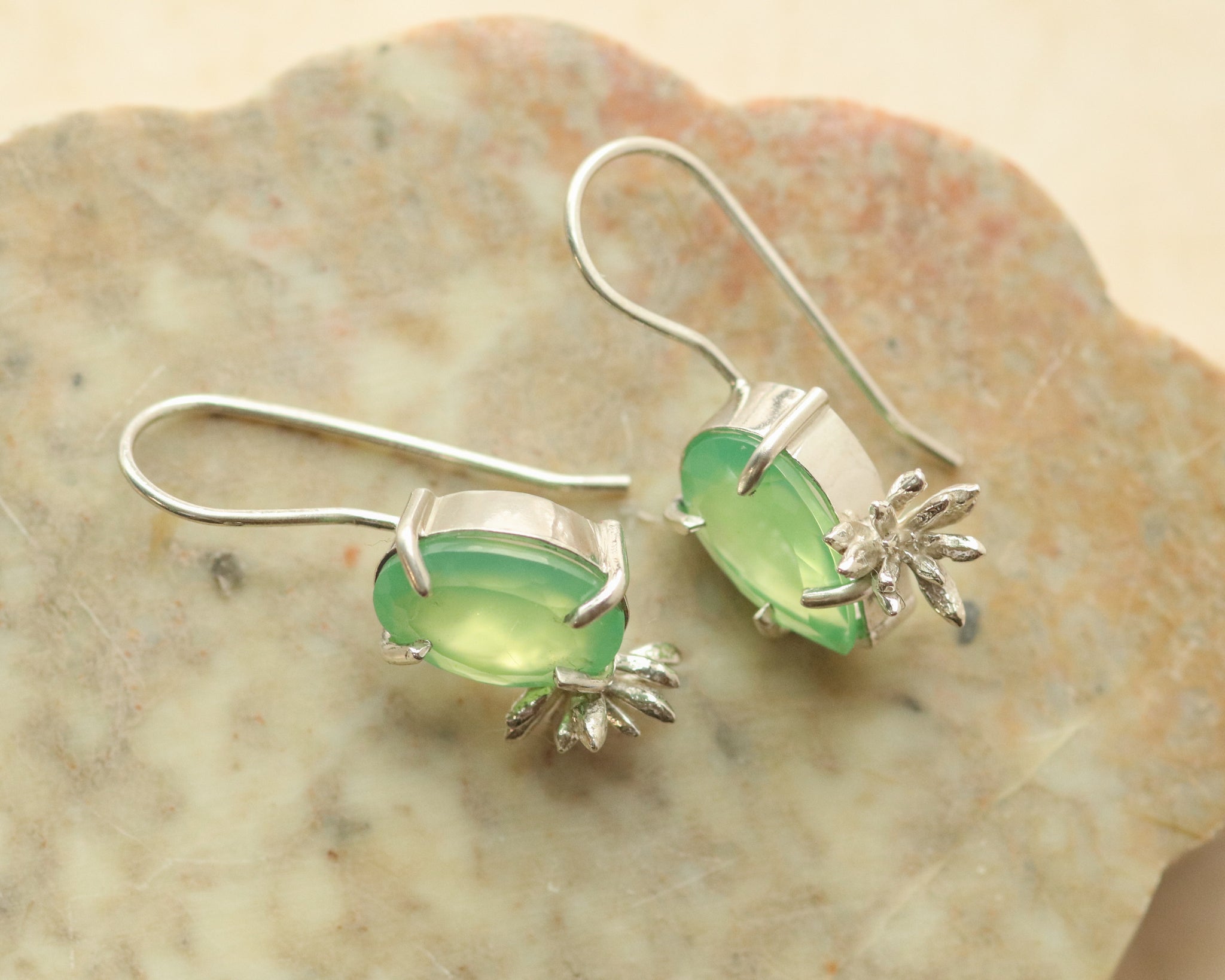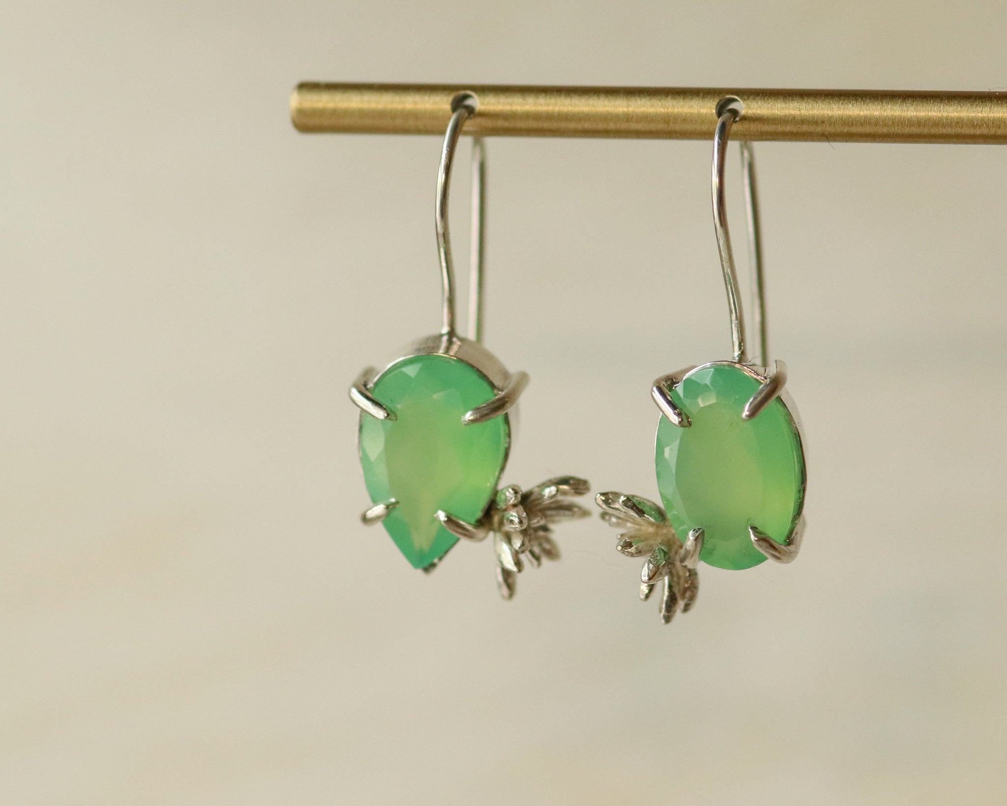 These stunning earrings are a celebration of vibrant hues and earthy elegance, featuring our Chrysoprase. These enchanting green tones evoke the lushness of tropical rainforests and sun-drenched gardens. Paired with delicate botanical accents, these earrings encapsulate the essence of nature's artistry.