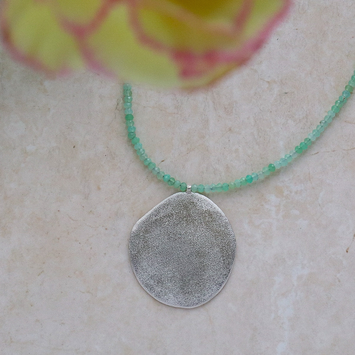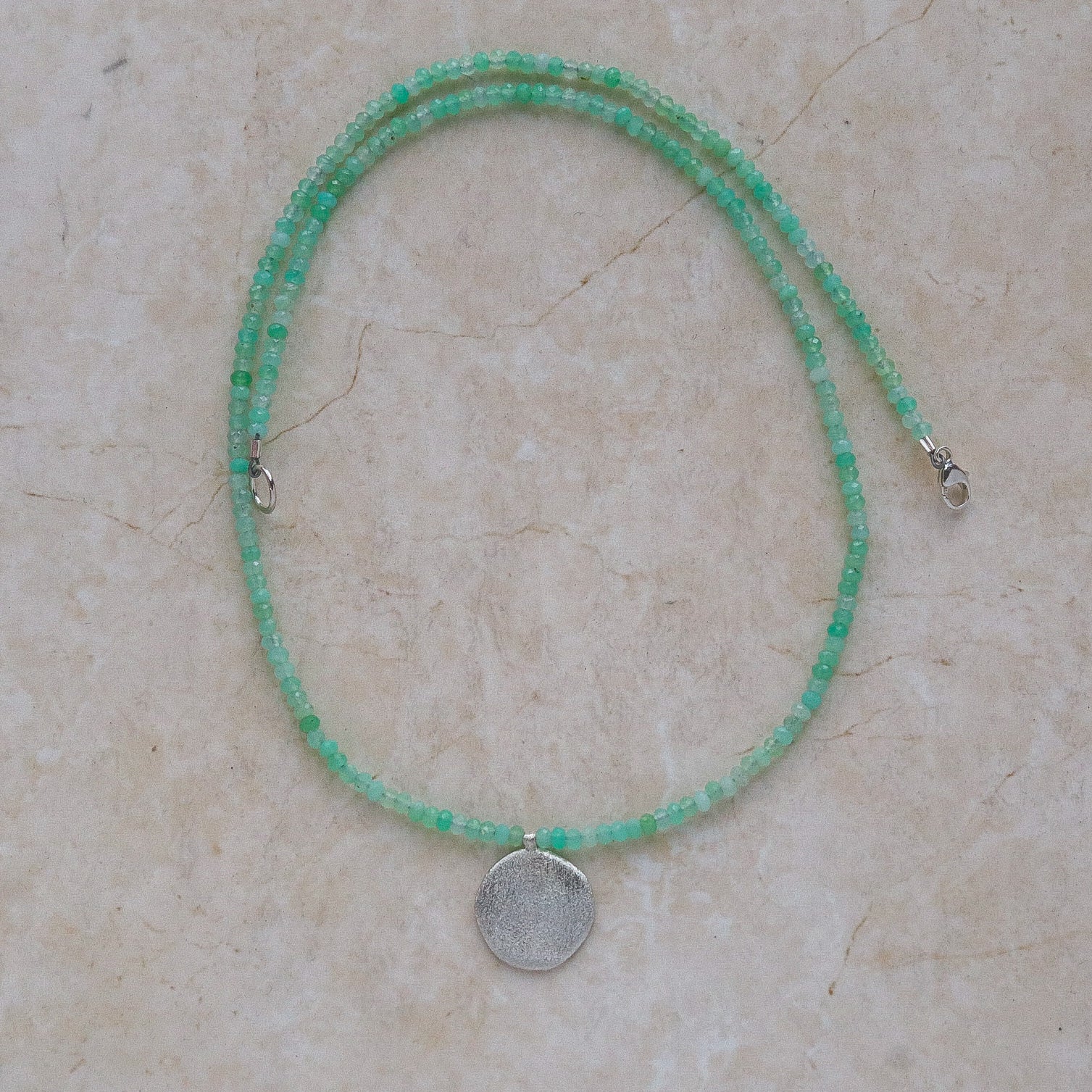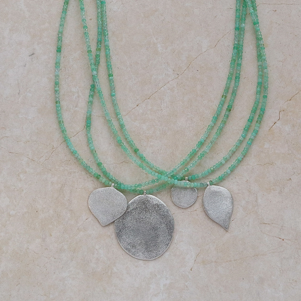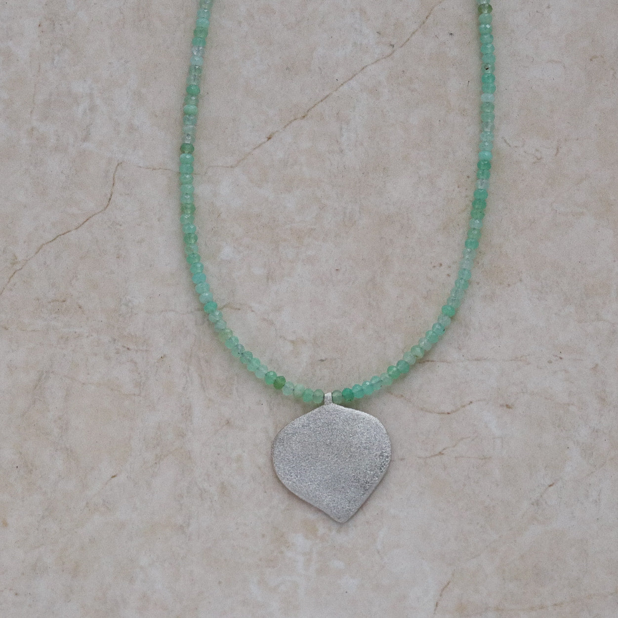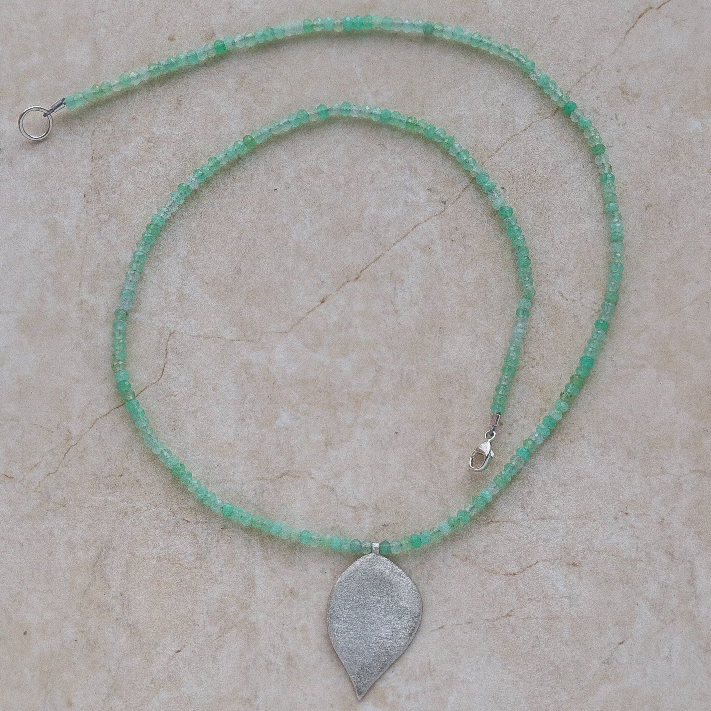 Chrysoprase beaded necklace featuring lush green gems and a delicate leaf silhouette for ultimate tropical allure.
