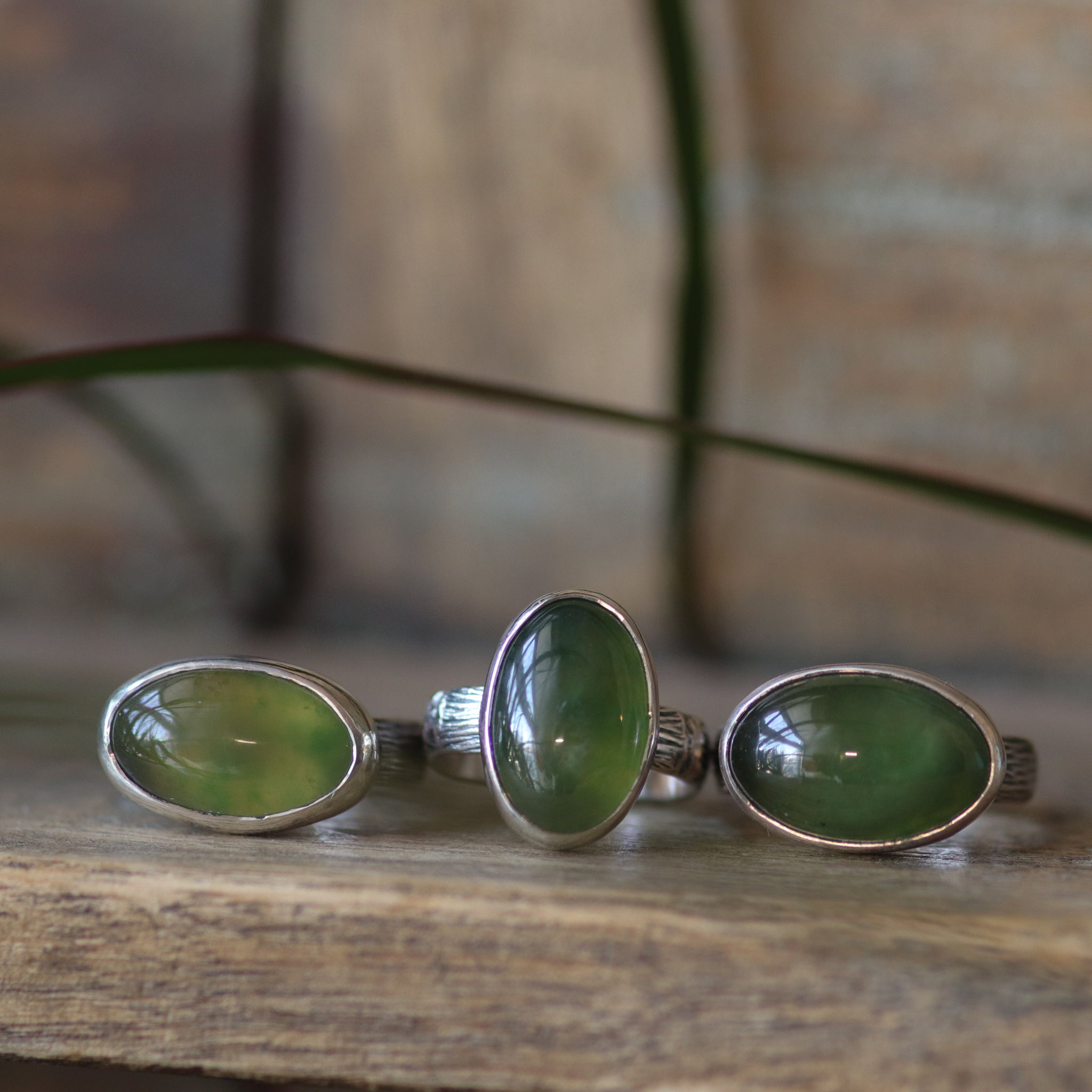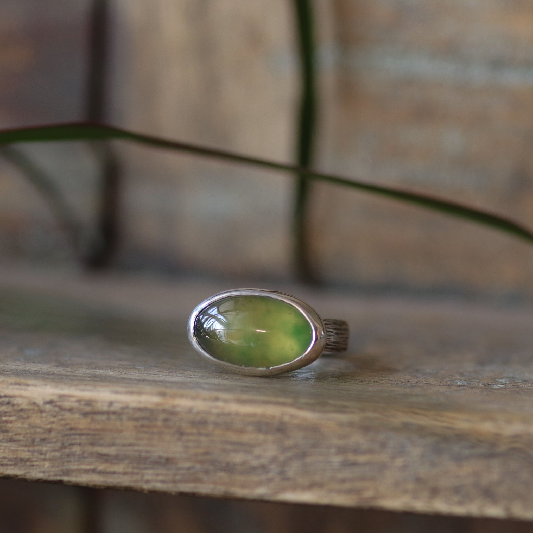 Green grossular garnet with pattern bamboo-like ring band set East/West.