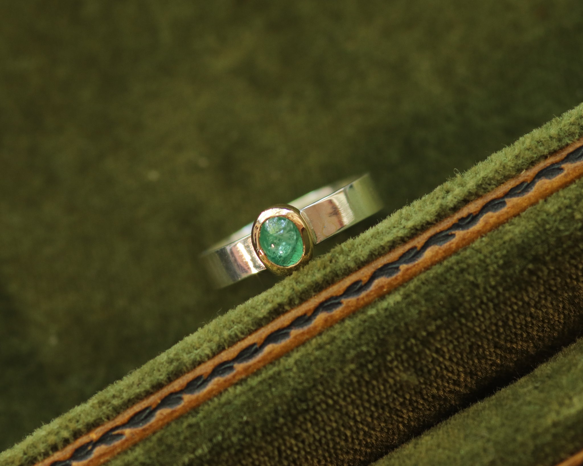 Light green Panjshir emerald rings. Emeralds are wrapped in a fairmined 14k yellow gold bezel on sterling silver ring band.