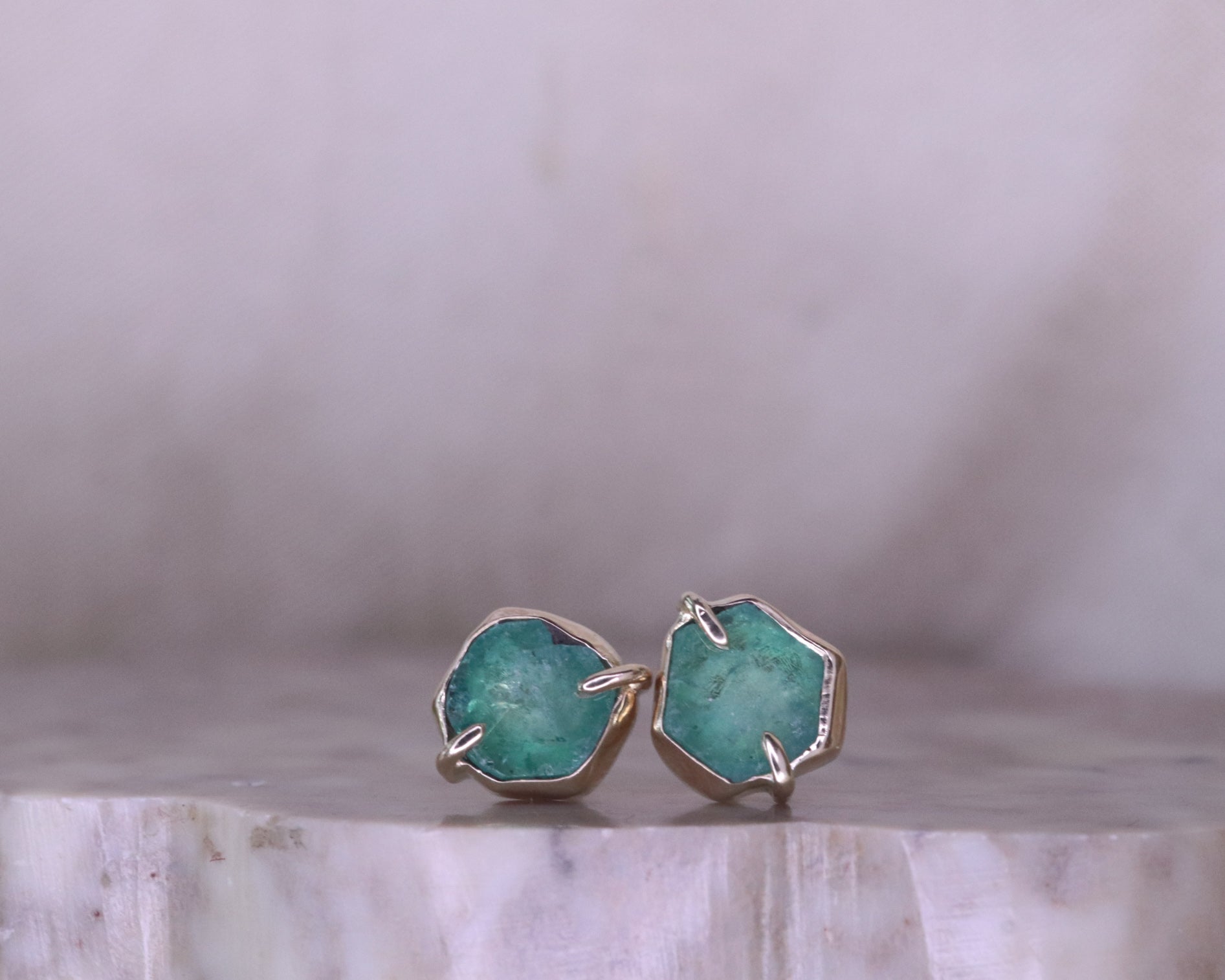 This earring features stunning Brazilian emerald slices held in 14k yellow gold.