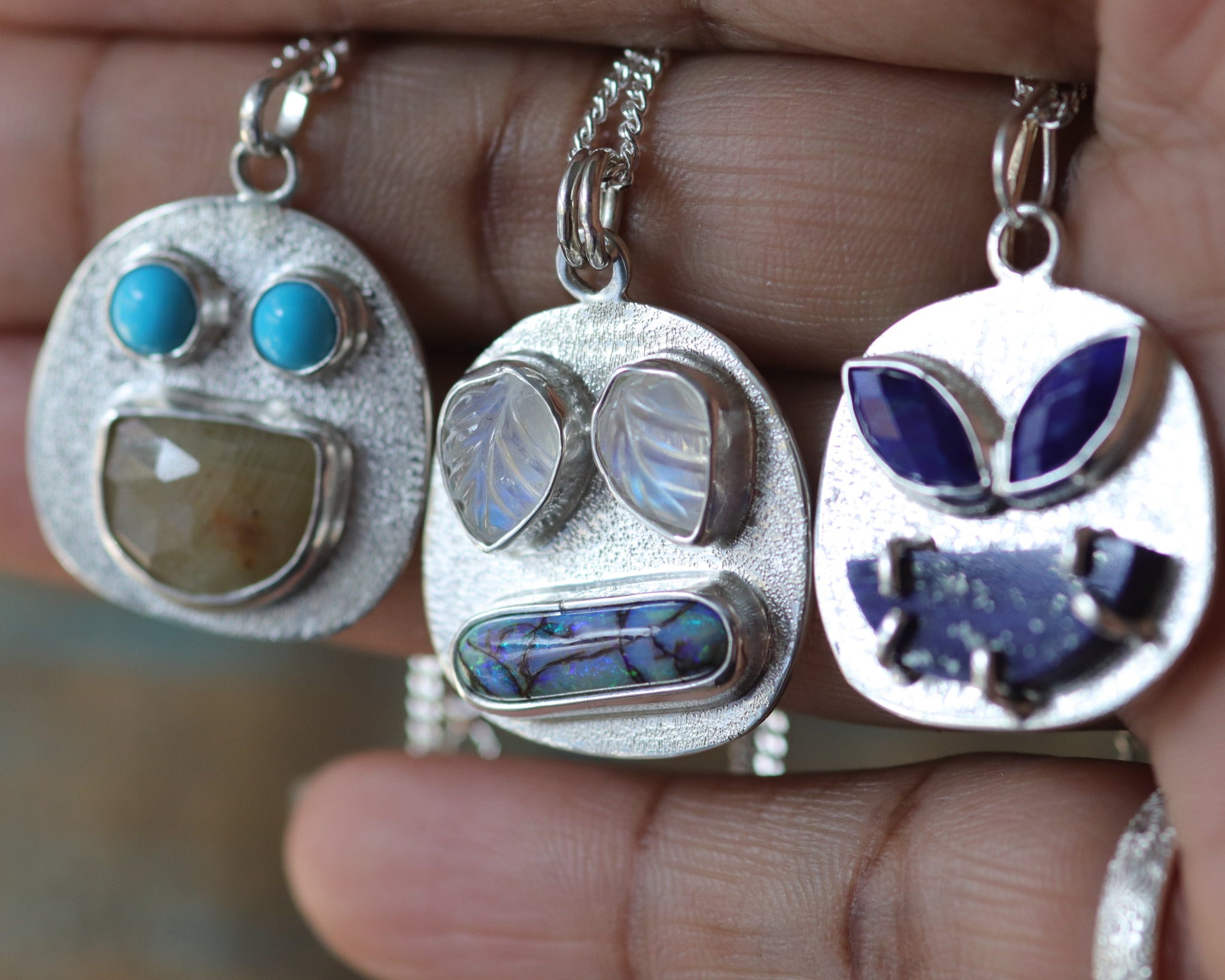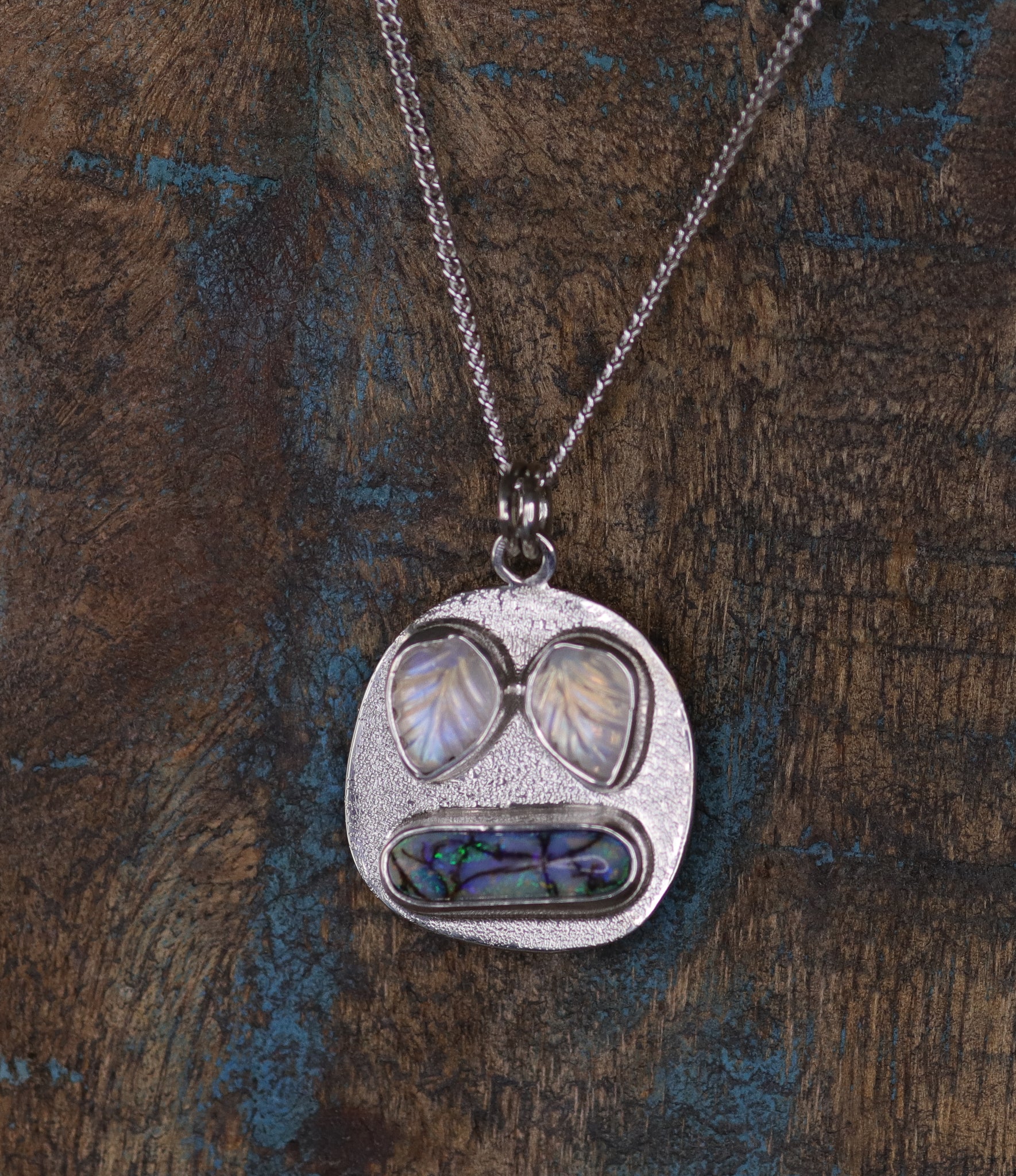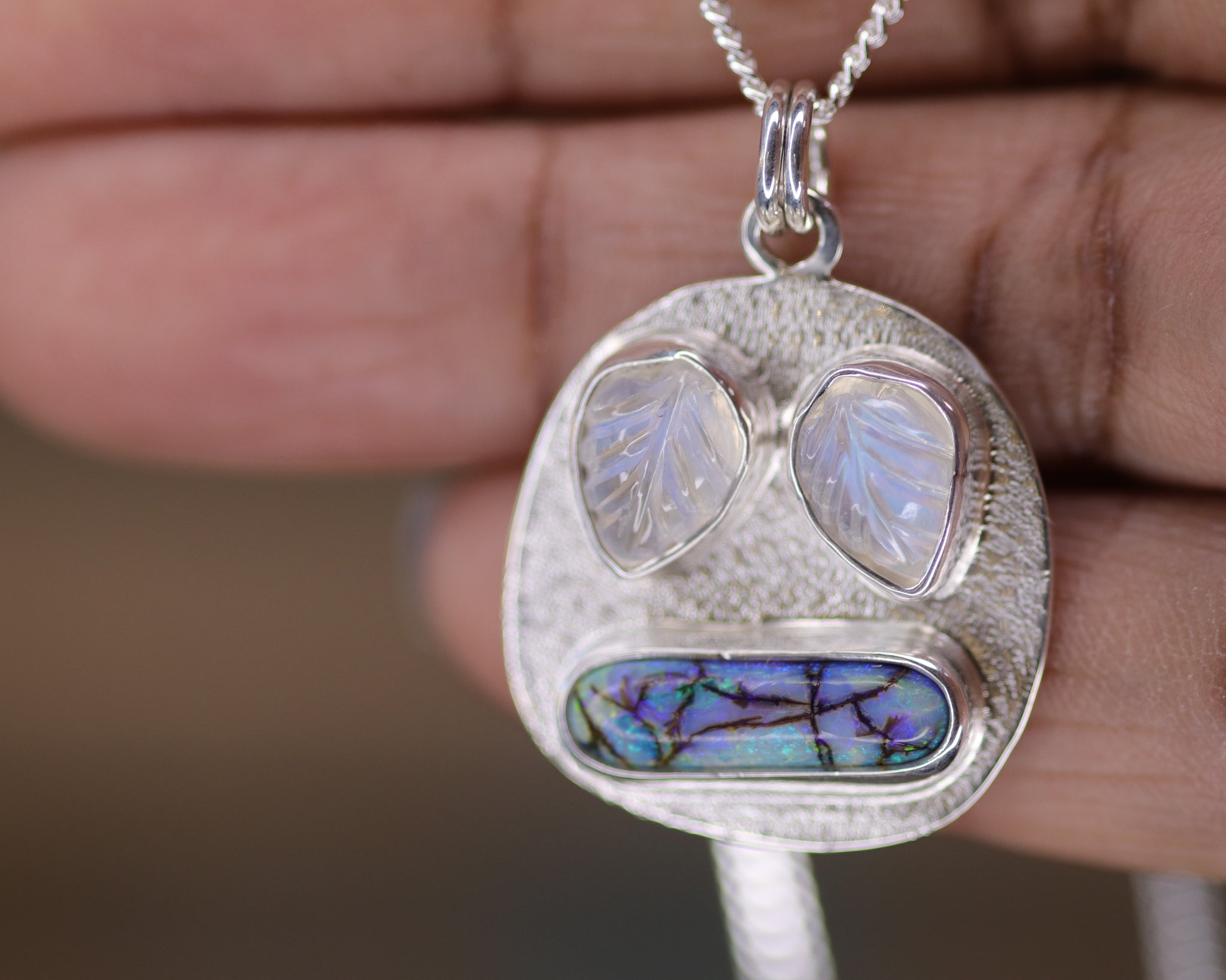 Sterling silver with these irridescent rainbow moonstone leaves and sterling opal create a mesmerizing spectacle, capturing the essence of whimsy and joy in this one-of-a-kind piece.