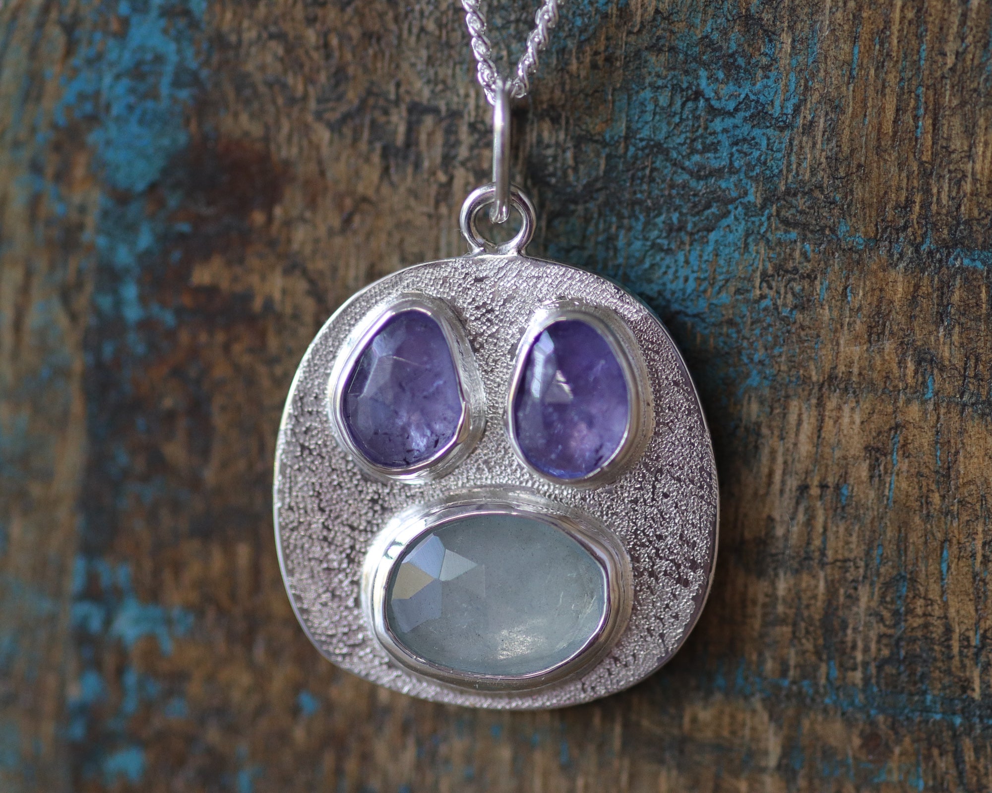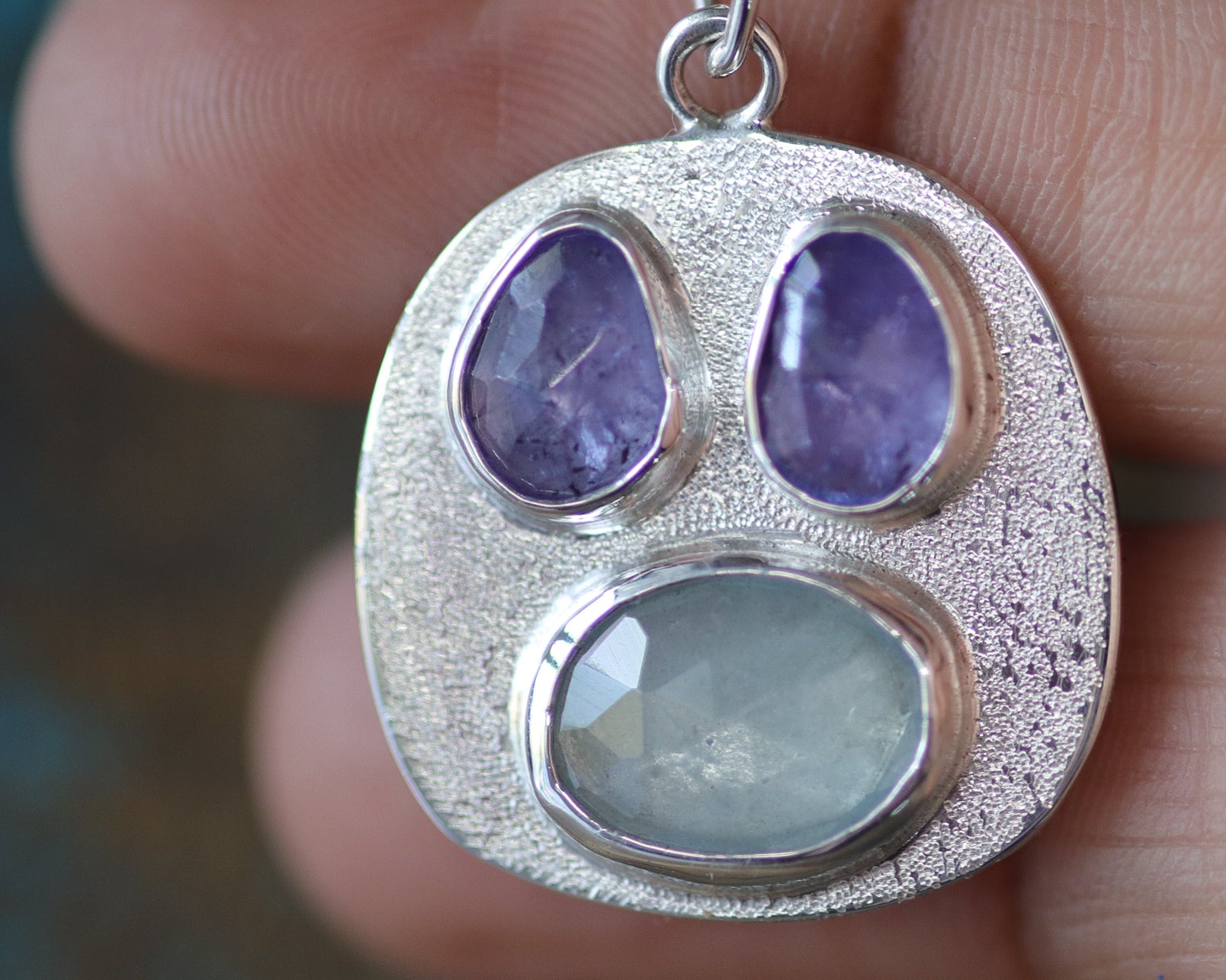 Sterling silver with these periwinkle tazanites and aqauamrine create a mesmerizing spectacle, capturing the essence of whimsy and joy in this one-of-a-kind piece.