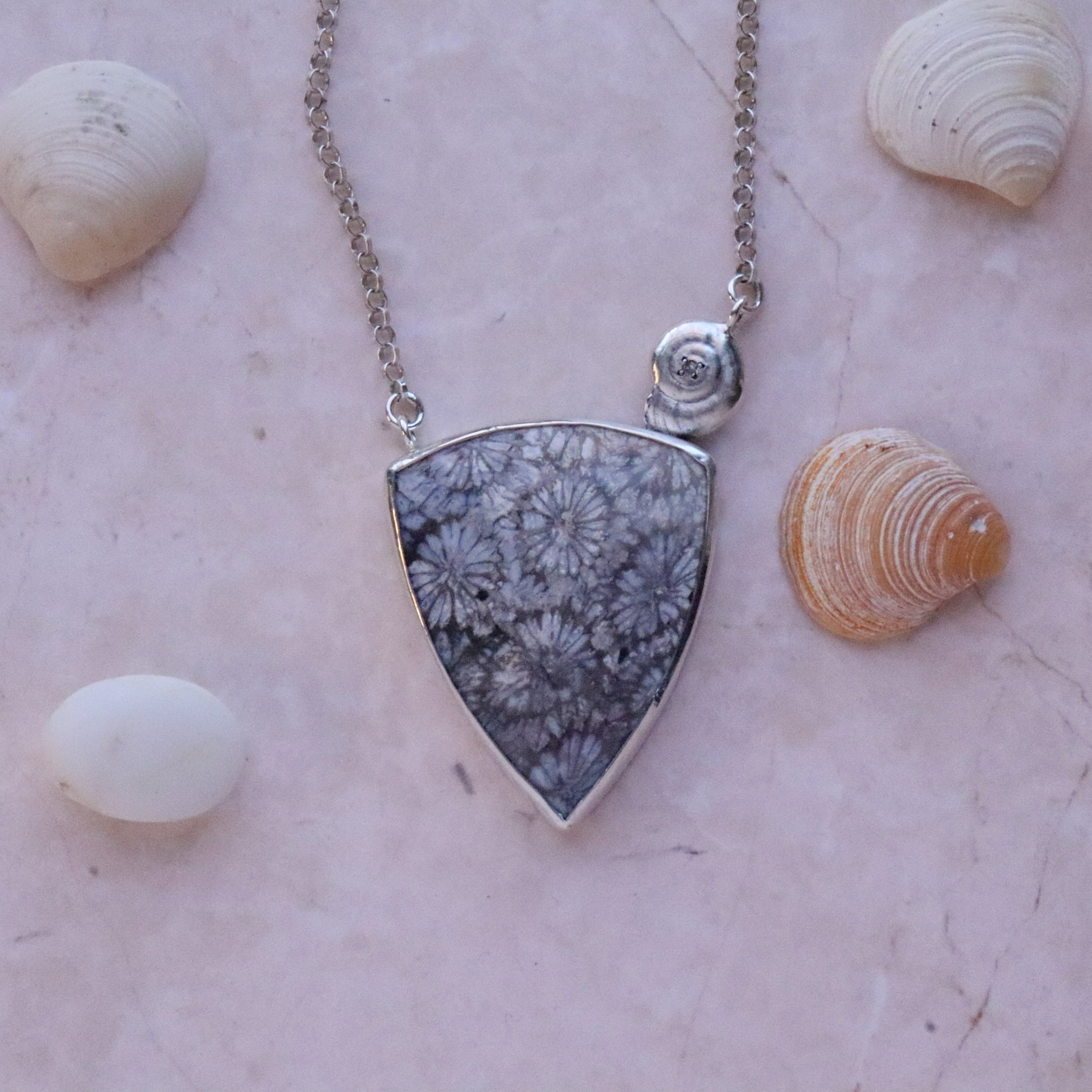 This necklace features a statement size fossilized coral stone acted with cast gastropod shell and Montana sapphire.