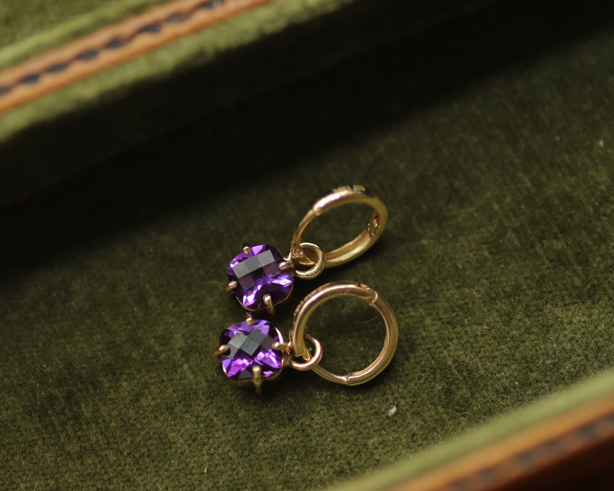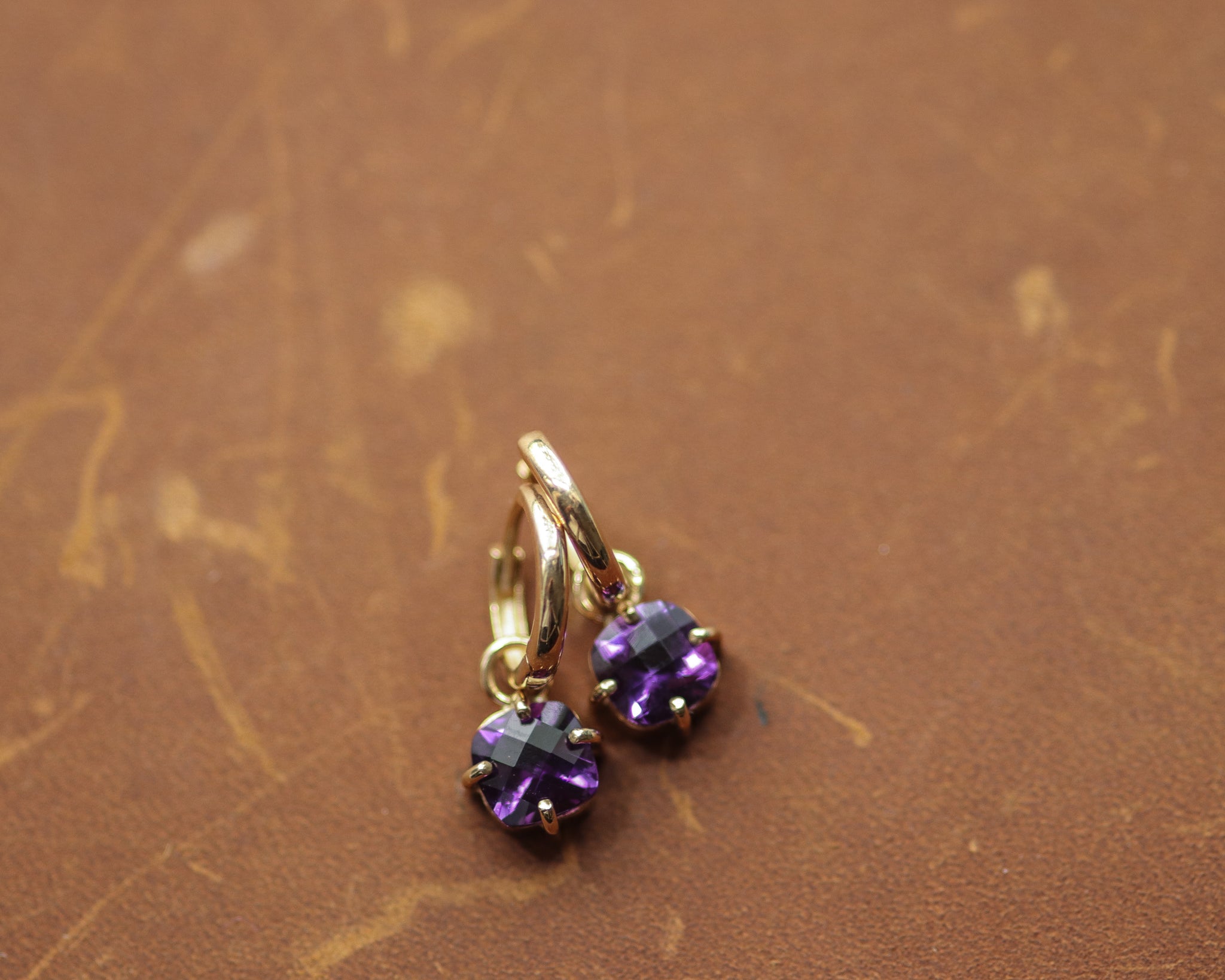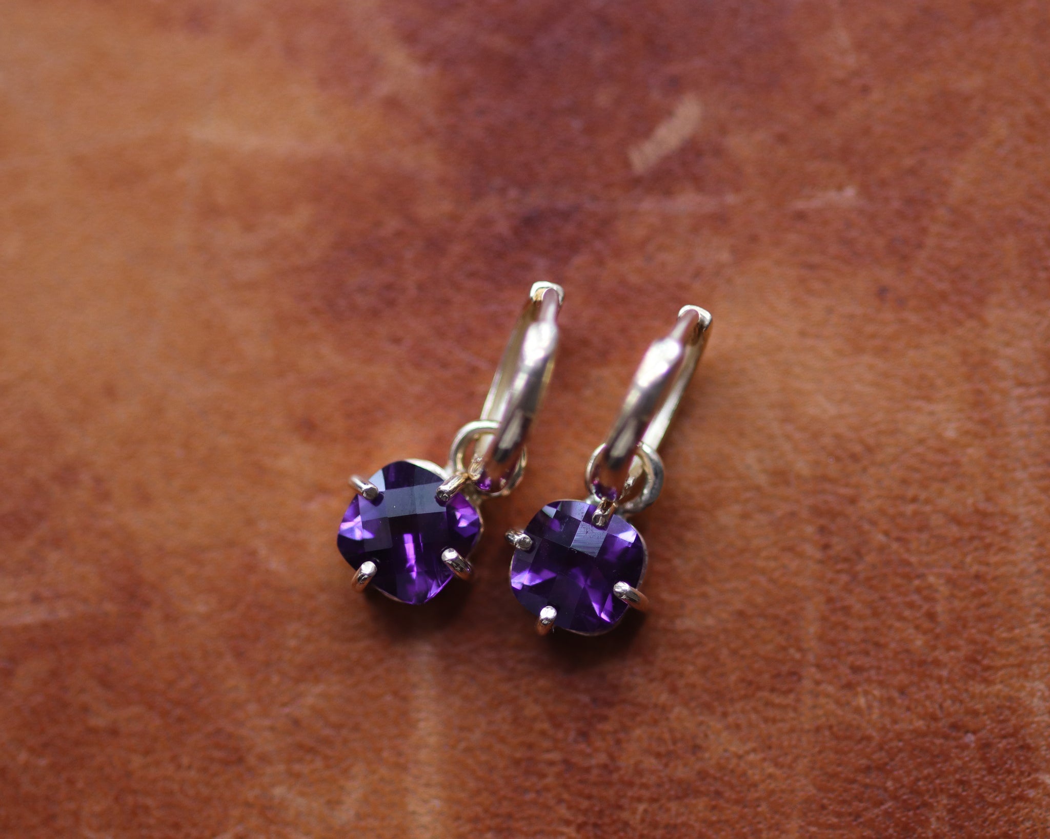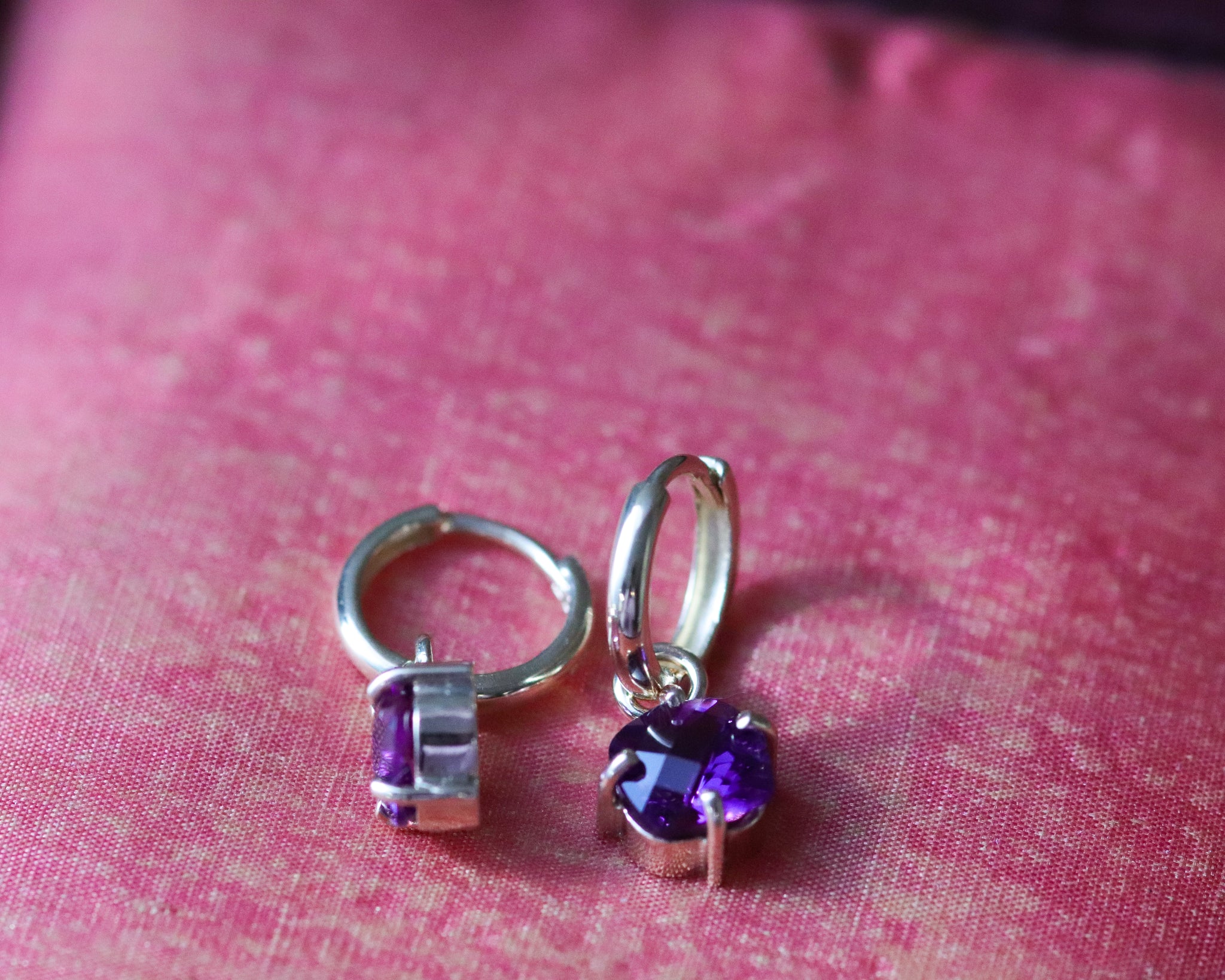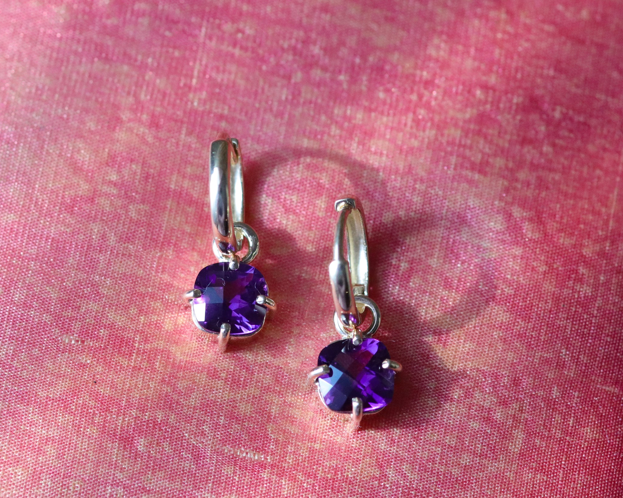 Minimal purple Fair Trade amethyst huggie hoop earrings with 8mm checkerboard cut Iris amethyst.