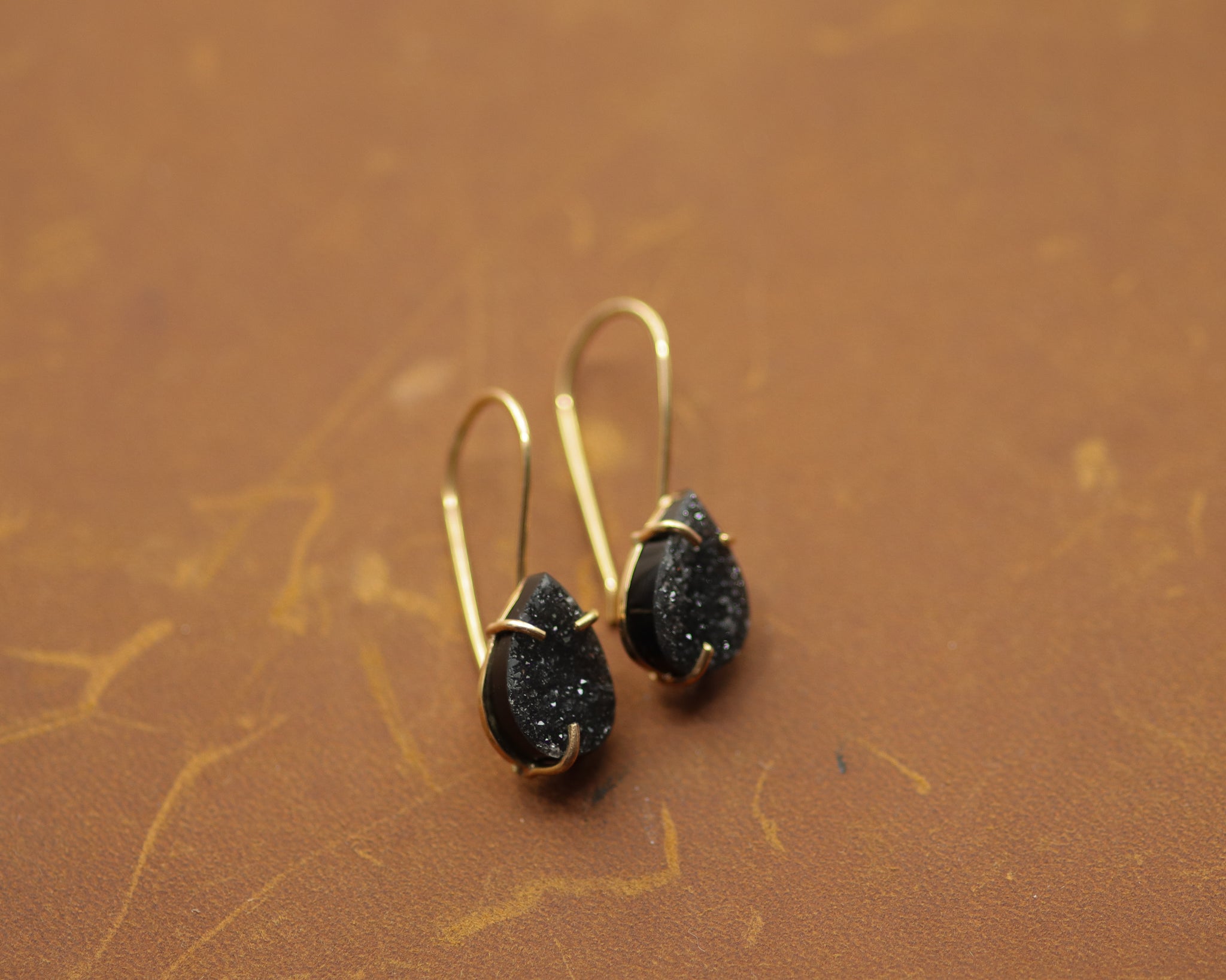 Shimmery black druzy nestled in a 10k yellow gold setting.