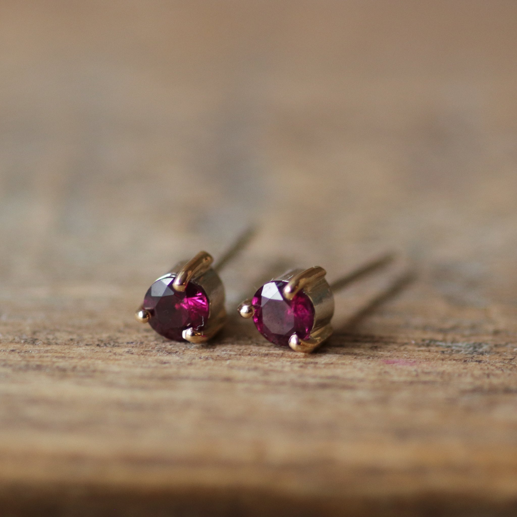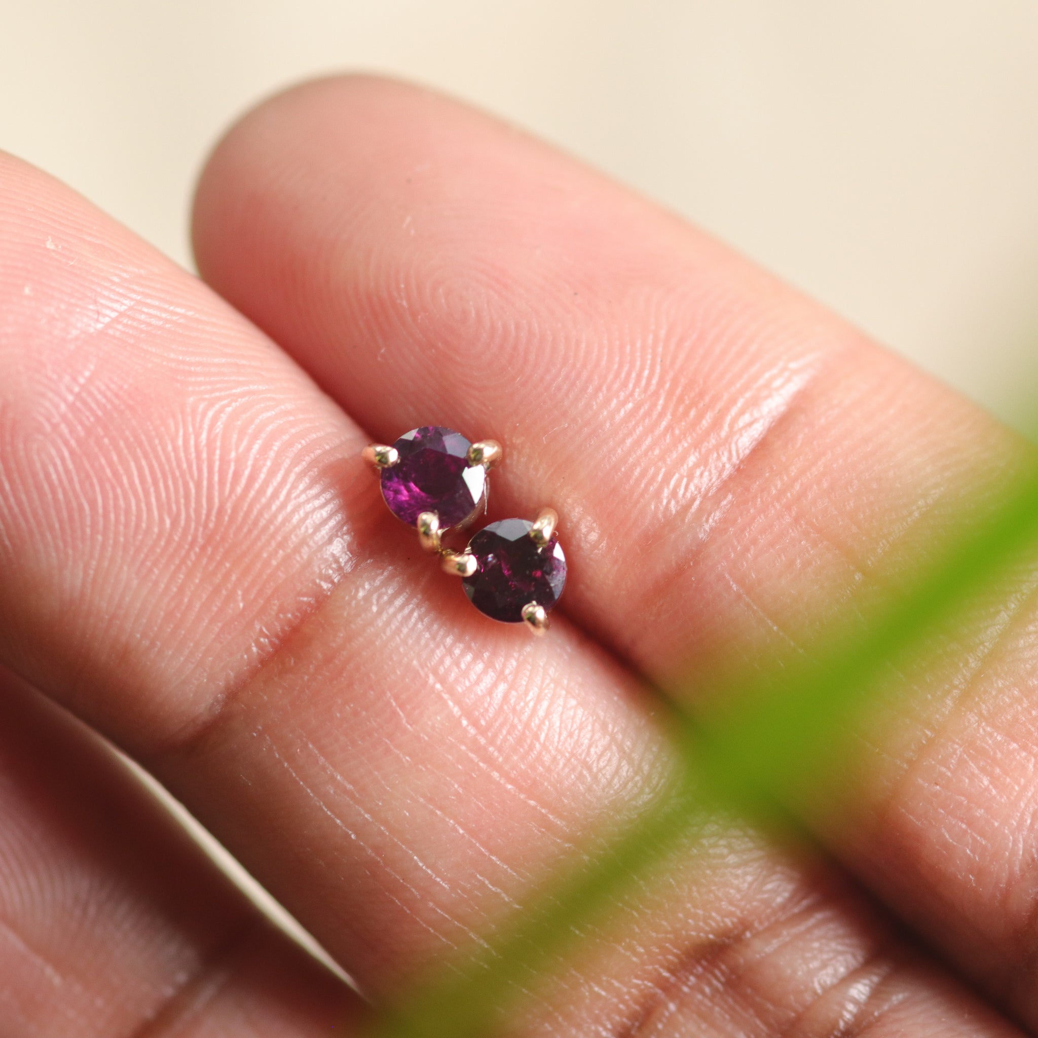 3mm round purple garnet gemstone with 14k yellow gold pronged setting.