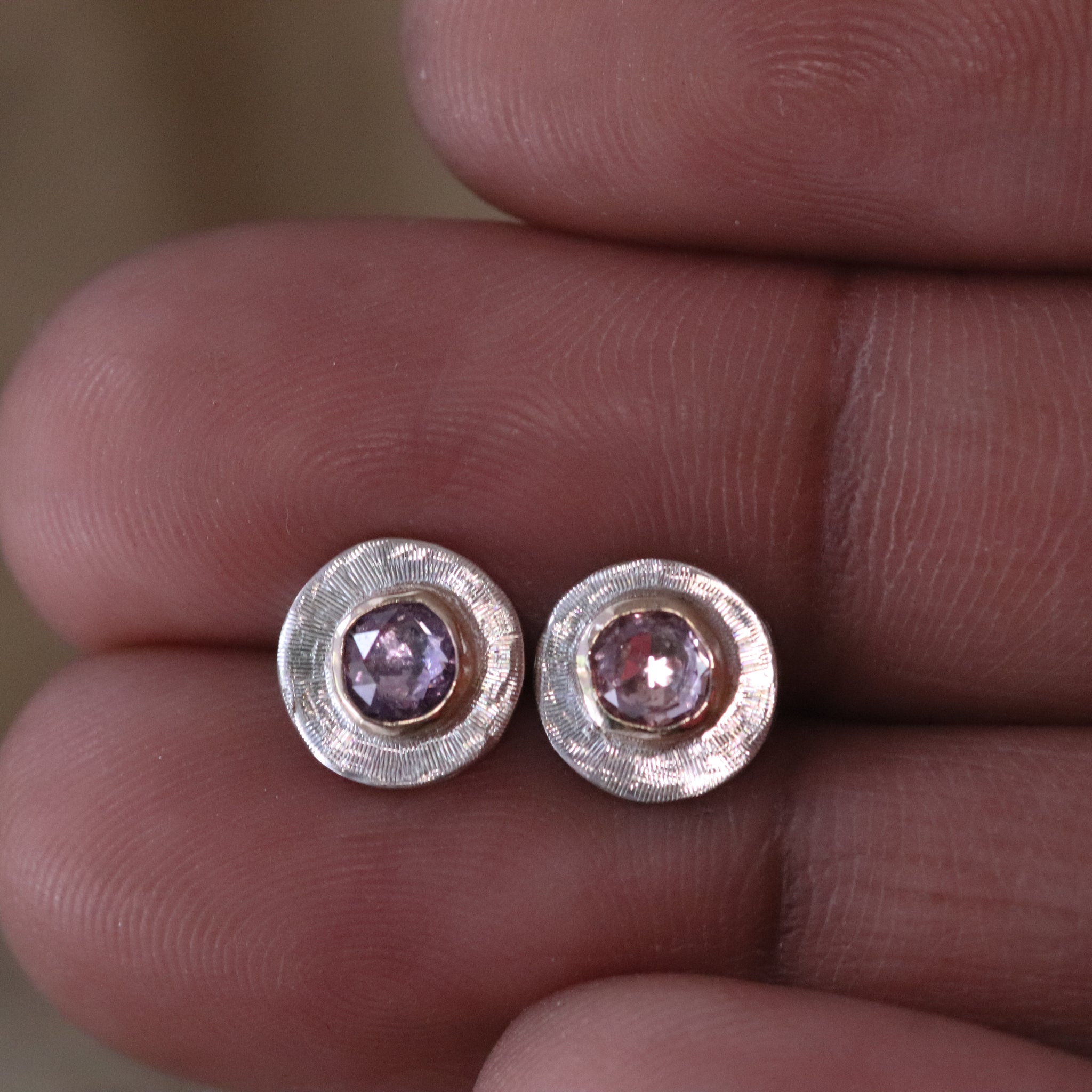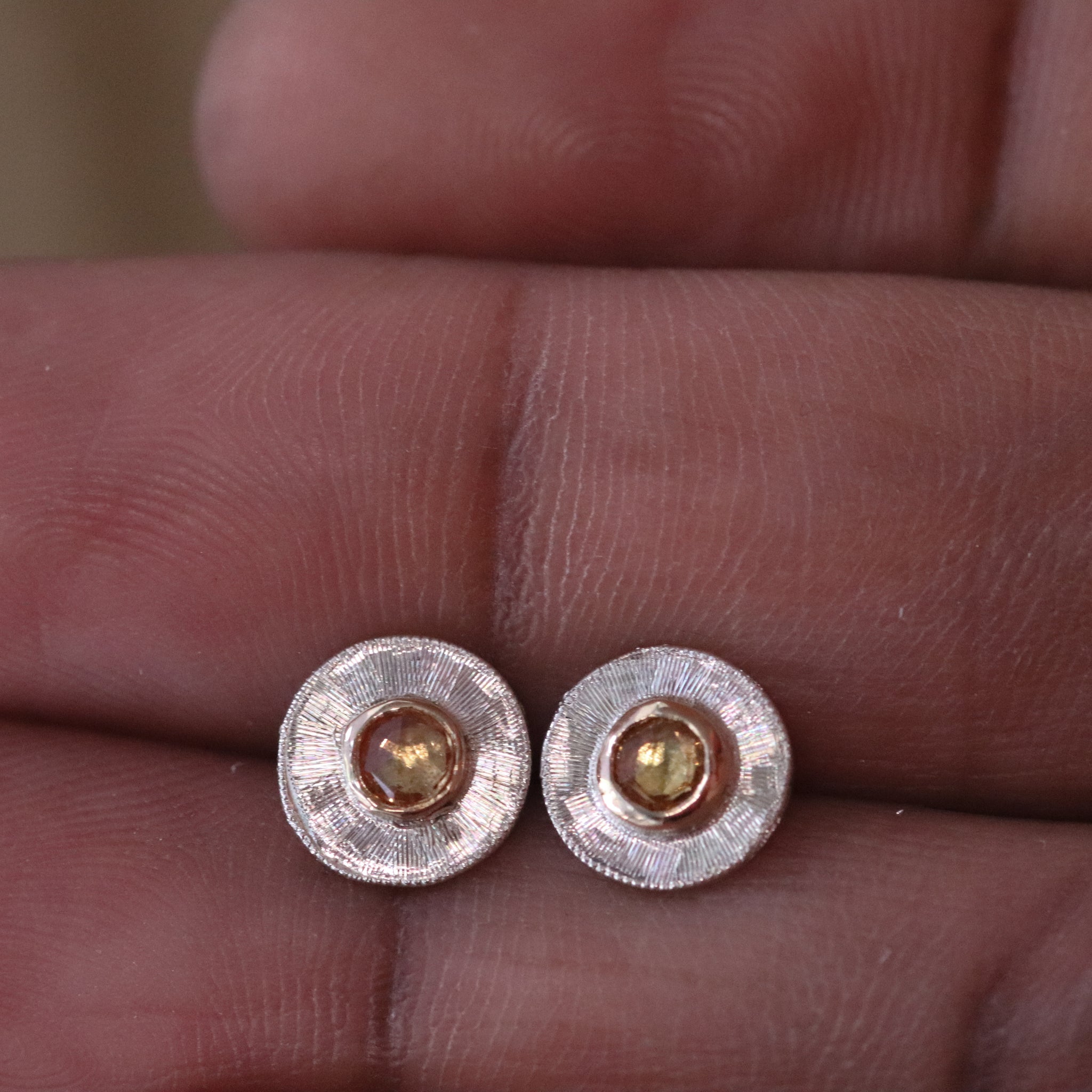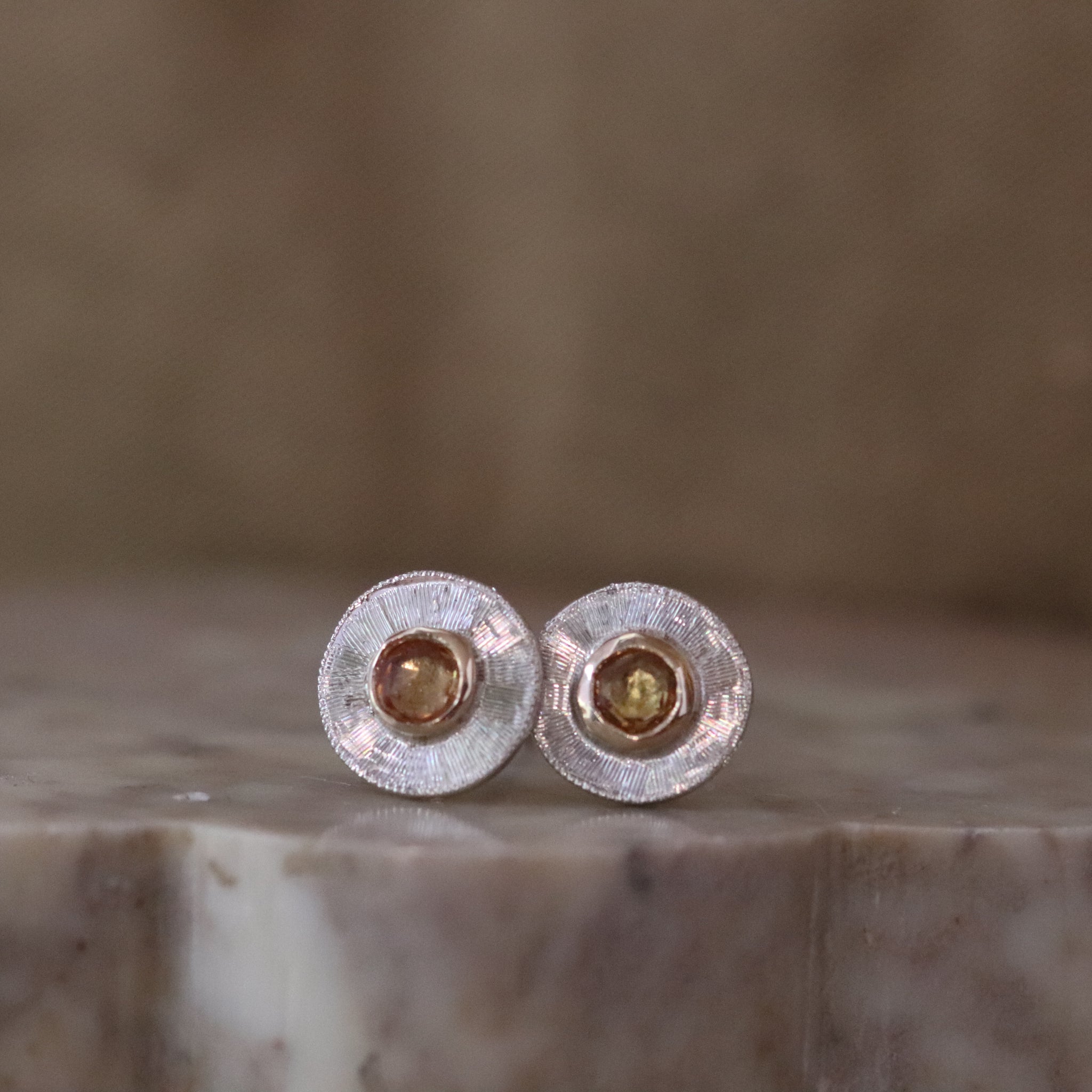 This earring features 3mm sapphires wrapped in 14k yellow gold on engraved sterling silver.