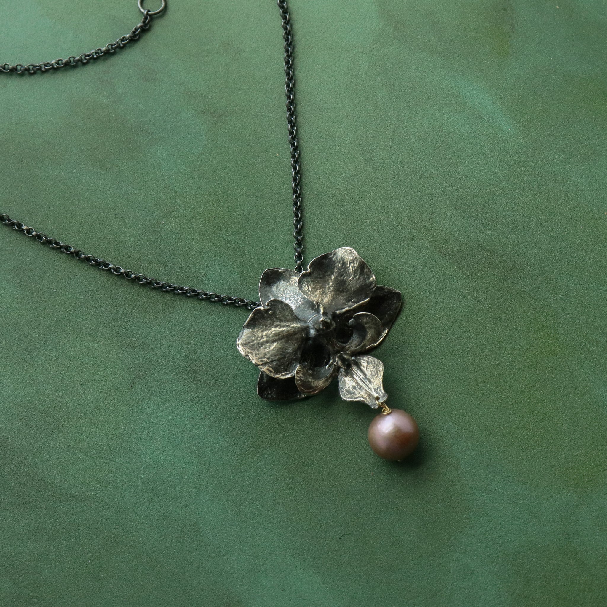 Elevate your style with this stunning orchid pendant, gracefully suspended from a 30-inch rolo chain with accented 12mm edison pearl. Make a bold statement and showcase your unique elegance with this captivating piece.