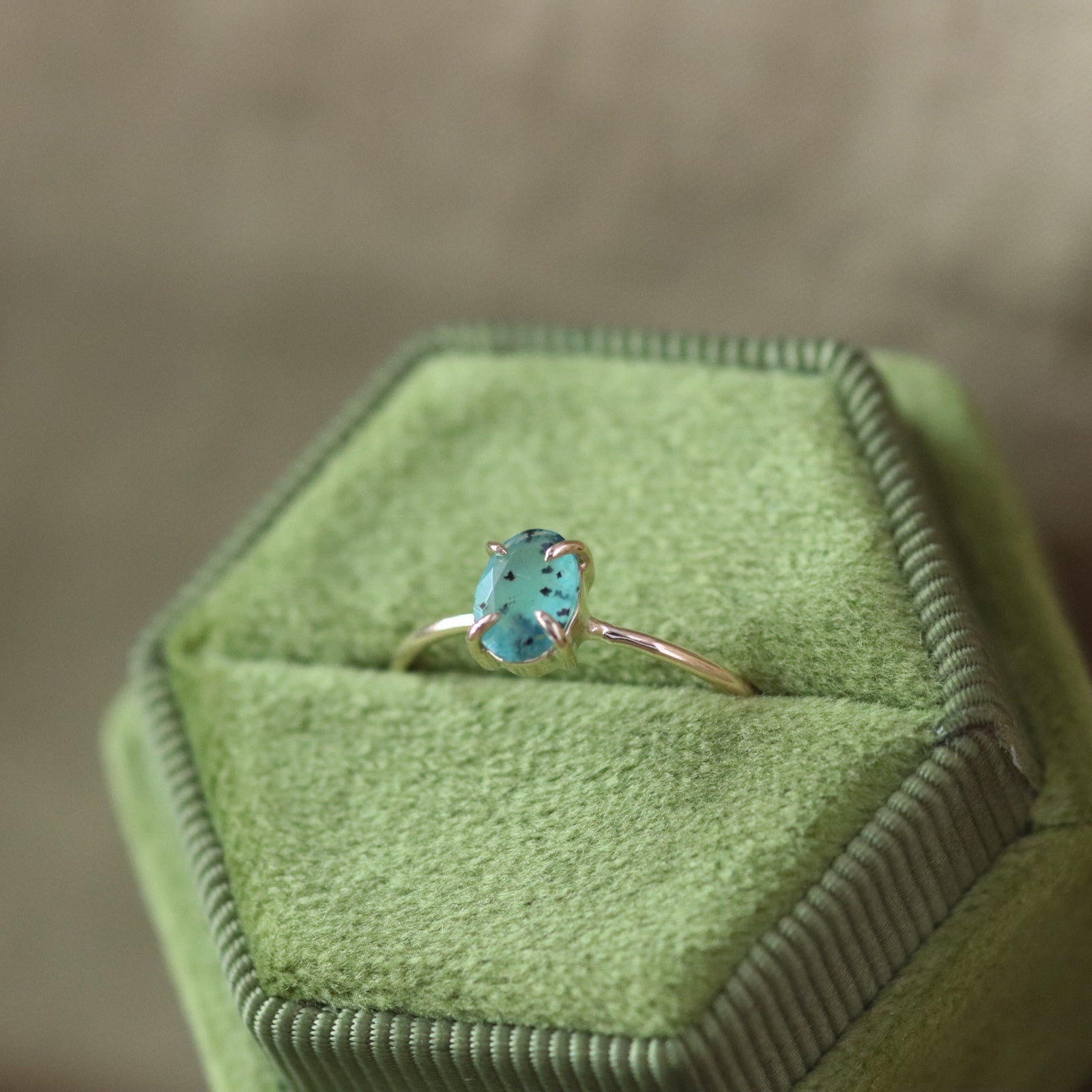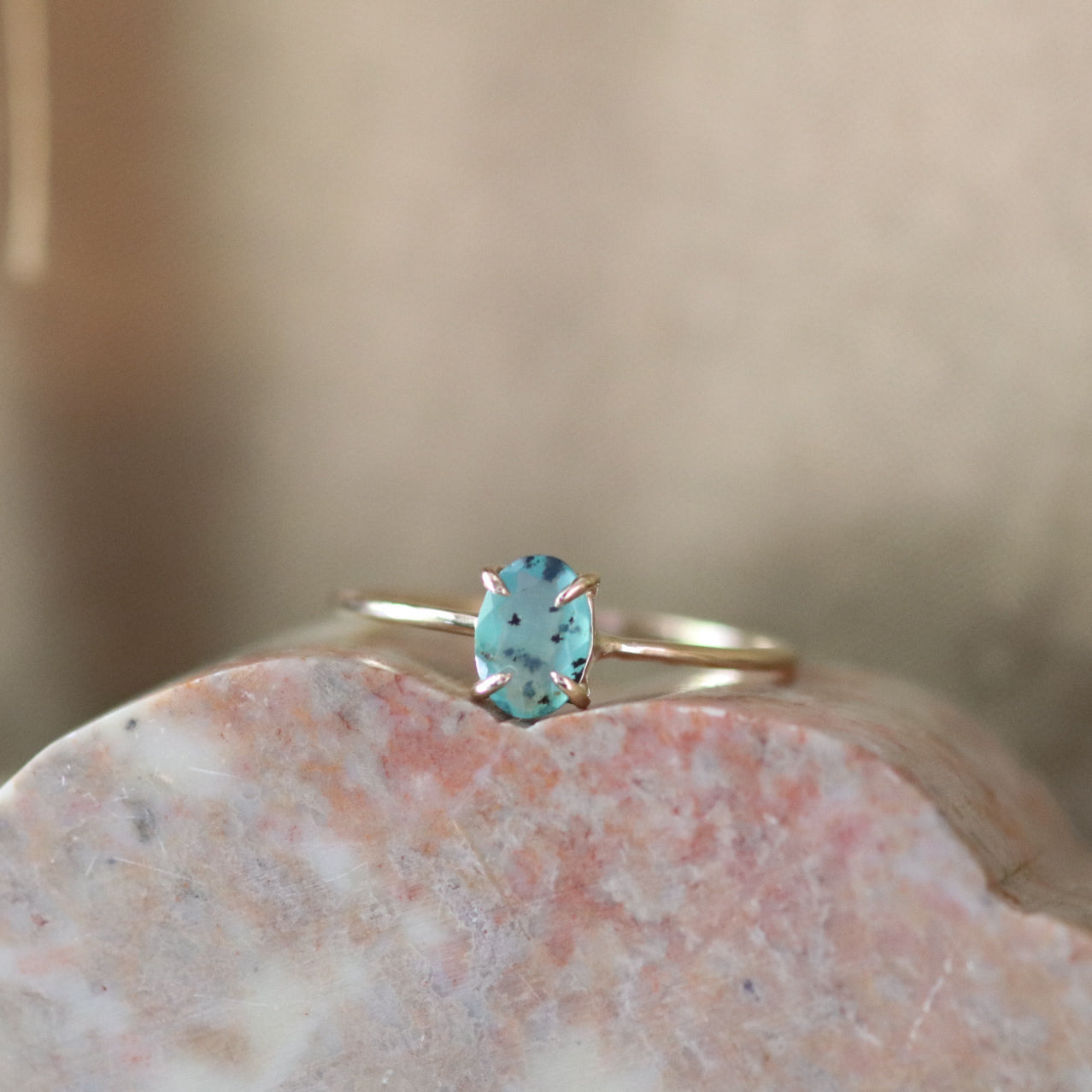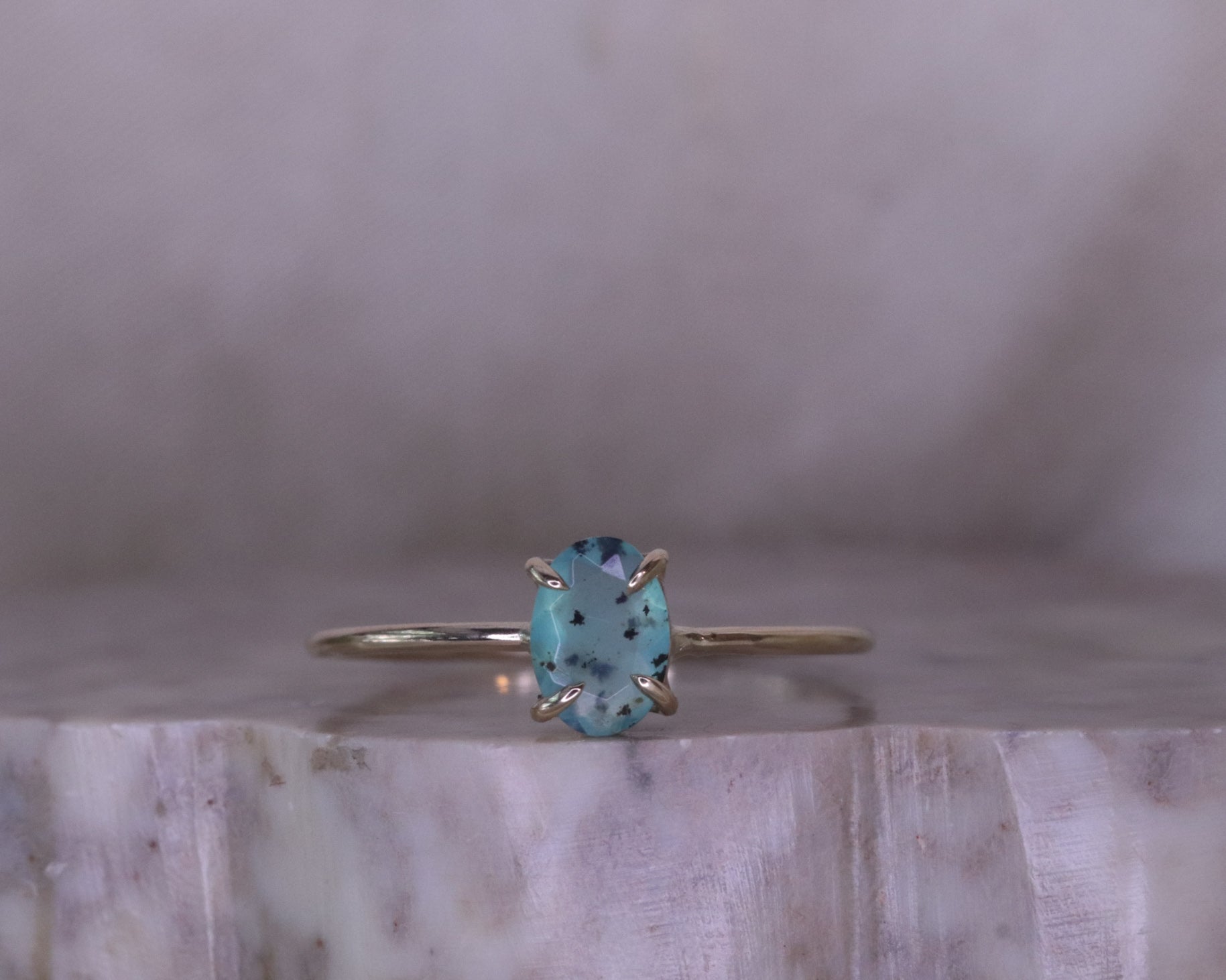 This ring features a stunning dendritic Peruvian blue opal, claw set, in 14k yellow gold atop a 1mm ring band.