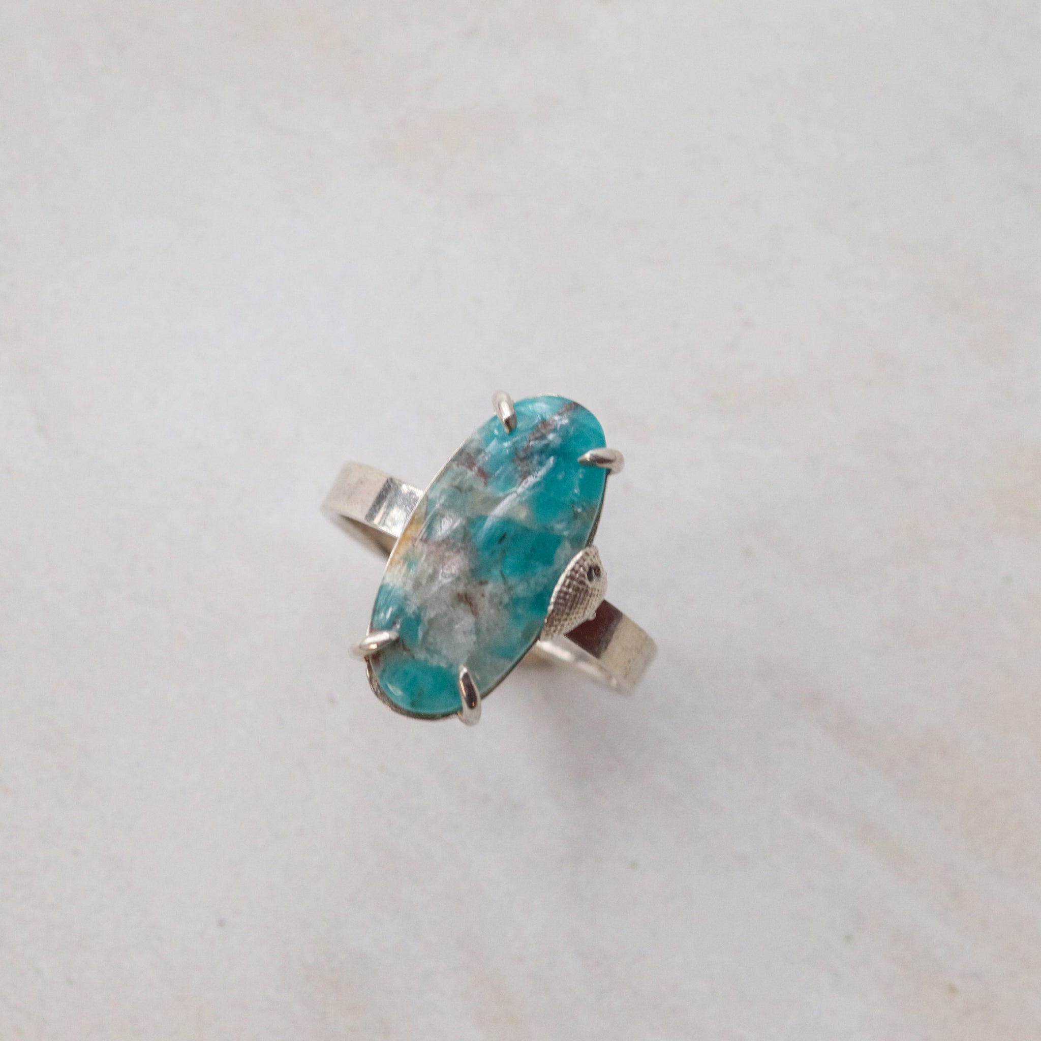 Cool and coastal, this silver ring features a tranquil amazonite in quartz stone with colours inspired by ocean tides and beachside breezes.