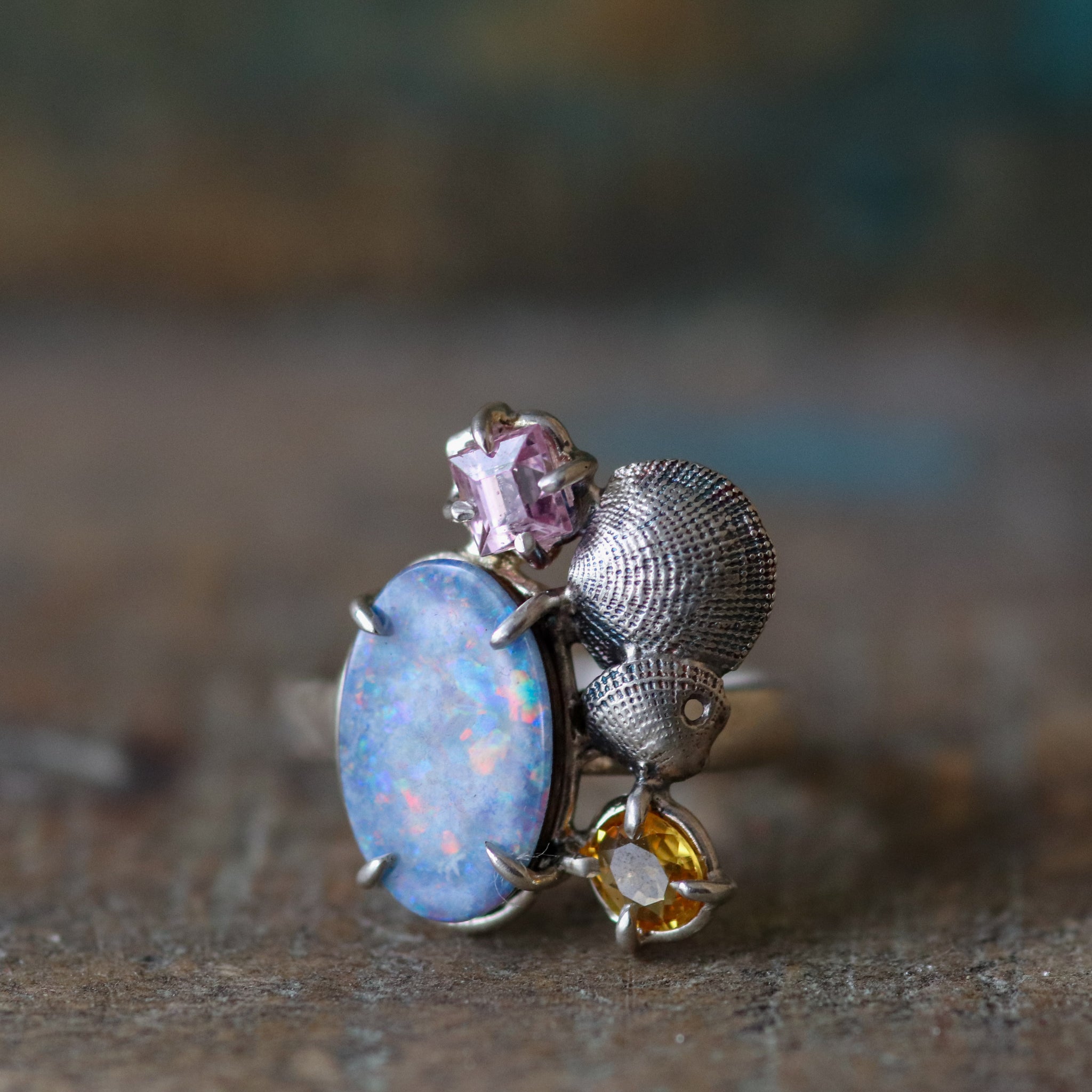 Your tropical escape starts here. This radiant treasure from the tropics, all in cool, polished silver, features a shimmering opal centre that catches the light like ocean foam at sunrise—flanked by fiery orange garnet and juicy pink spinel.