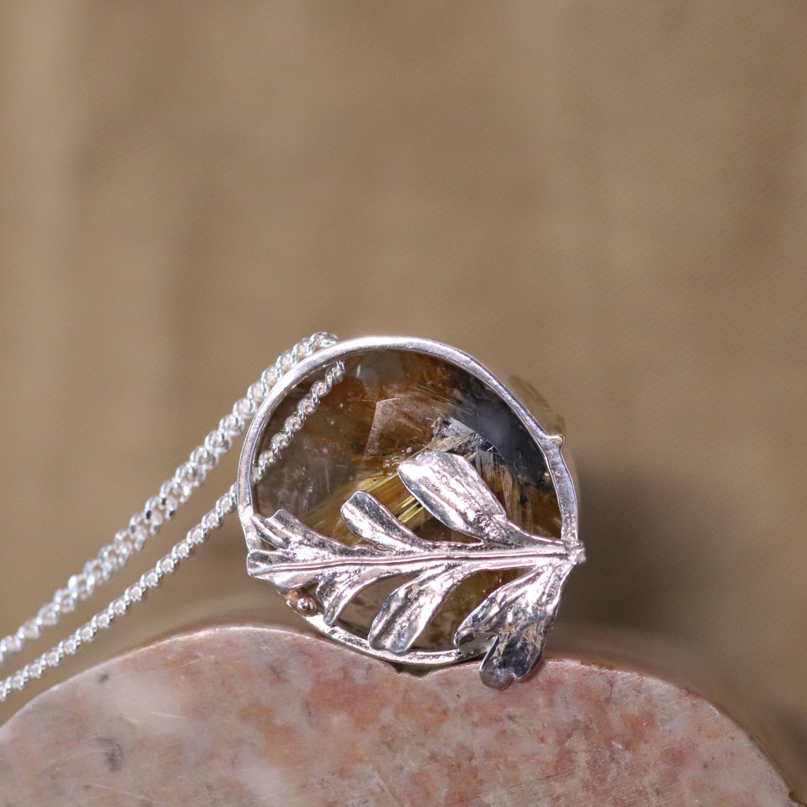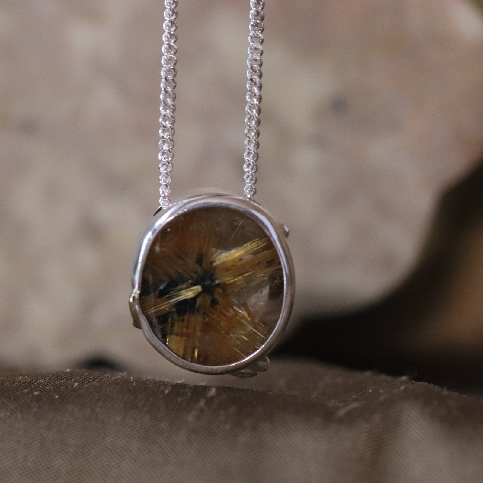 This necklace features a super star rutilated quartz gemstone with an open-back design accented with 14k yellow gold.