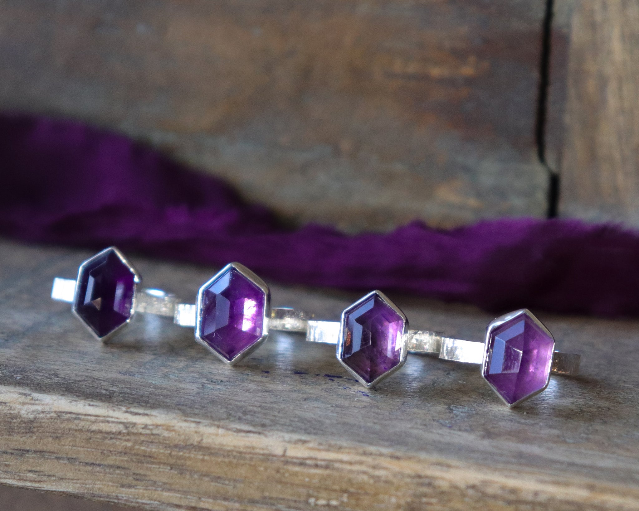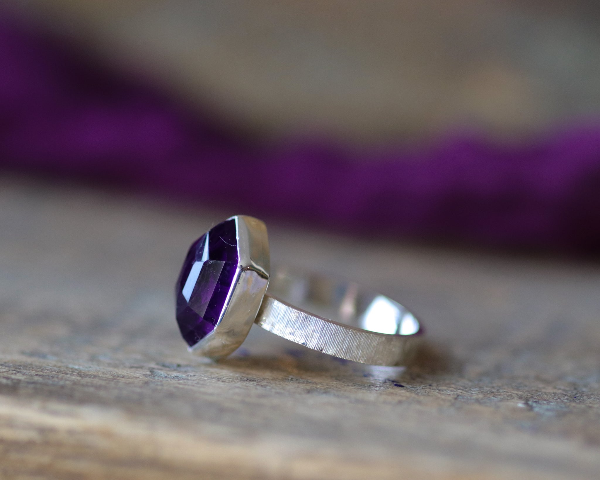 Geometric-shaped purple amethyst ring with a hand-engraved ring band. The ring band measures 3mmx1mm and is great for stacking with other rings. The hand-engraved band adds a touch of personalization and uniqueness to the ring. This ring is perfect for those who love to stack their rings and make it a statement piece.