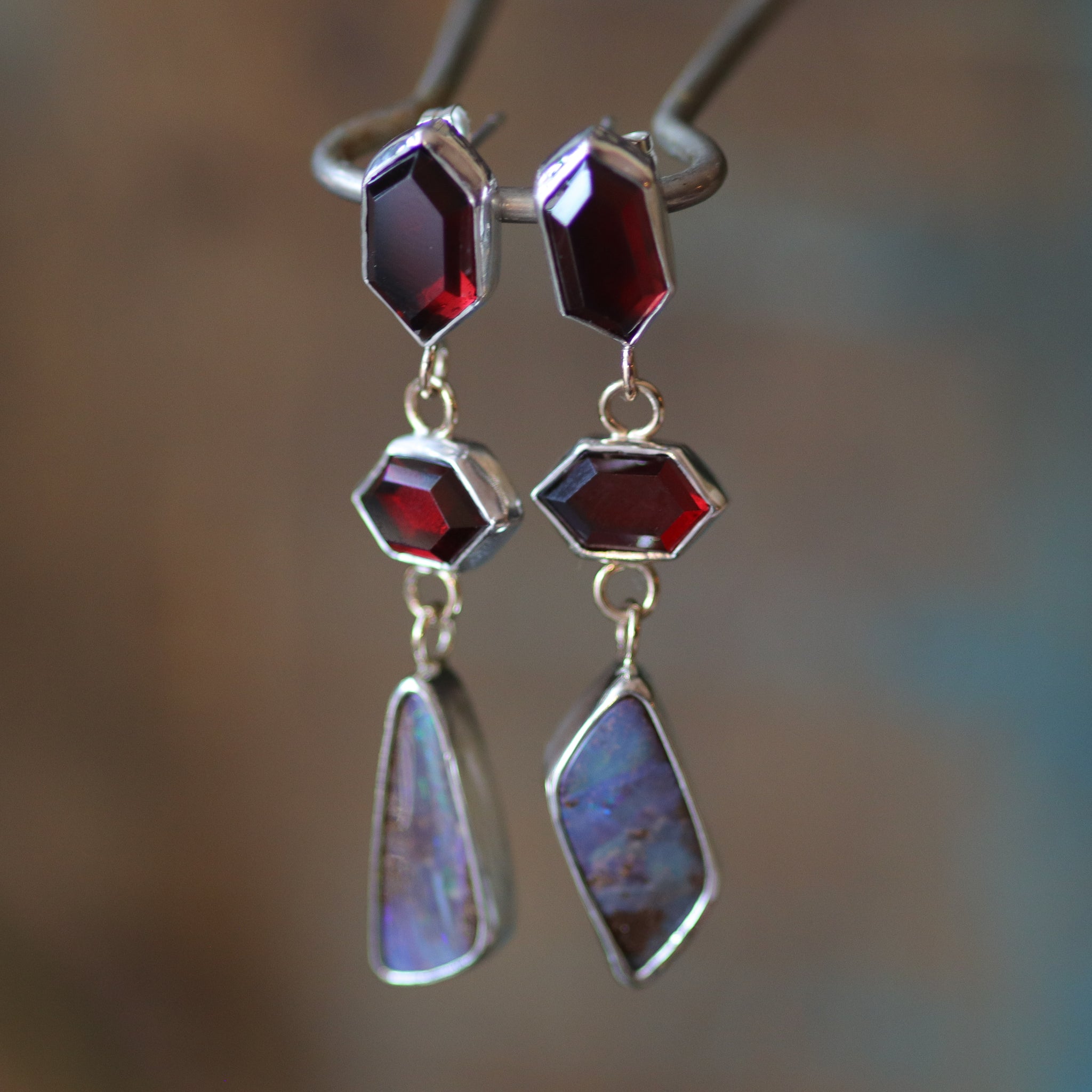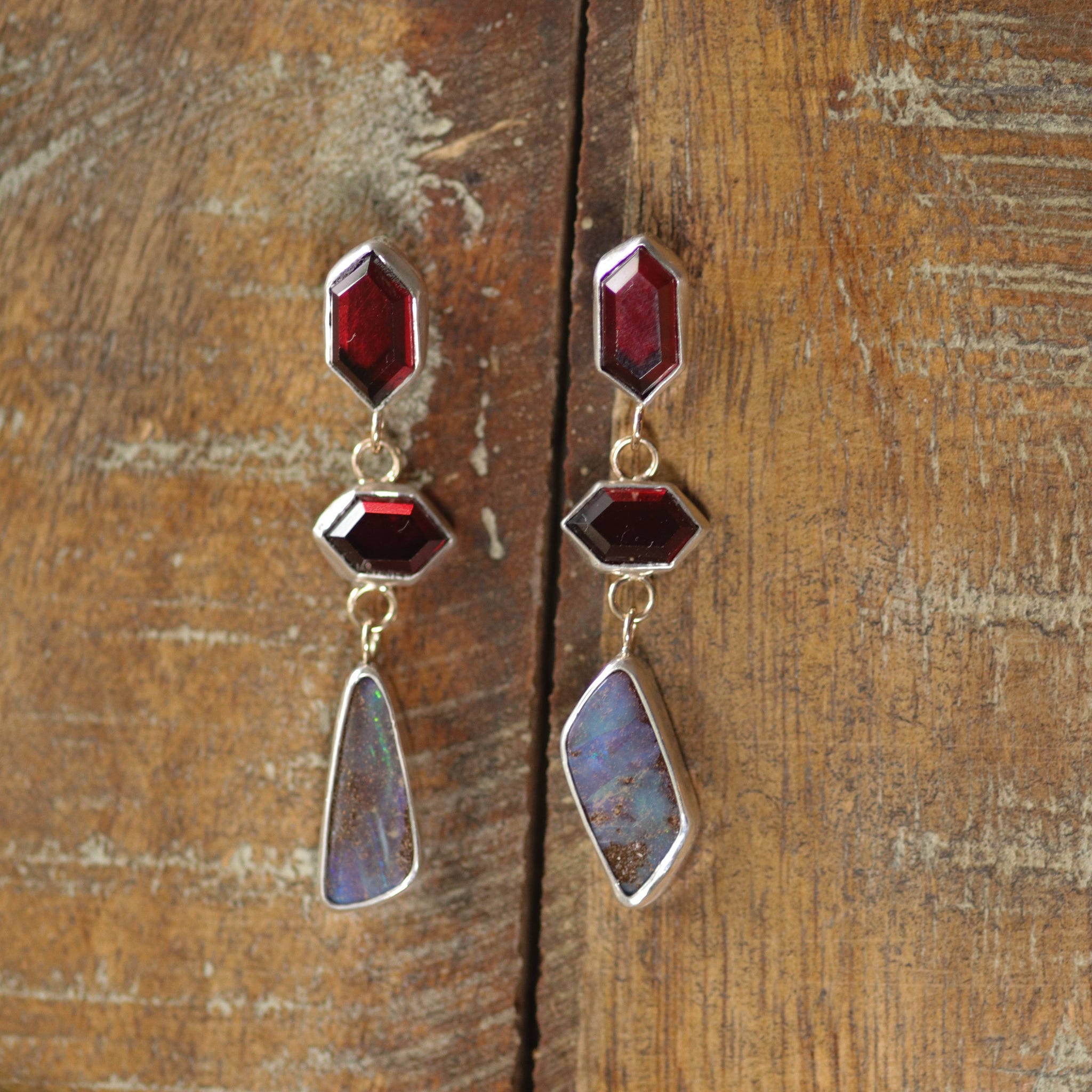 A pair of stunning statement earrings are crafted from a blend of Mozambique garnets and Australian boulder opal, featuring an asymmetrical design for a unique touch.