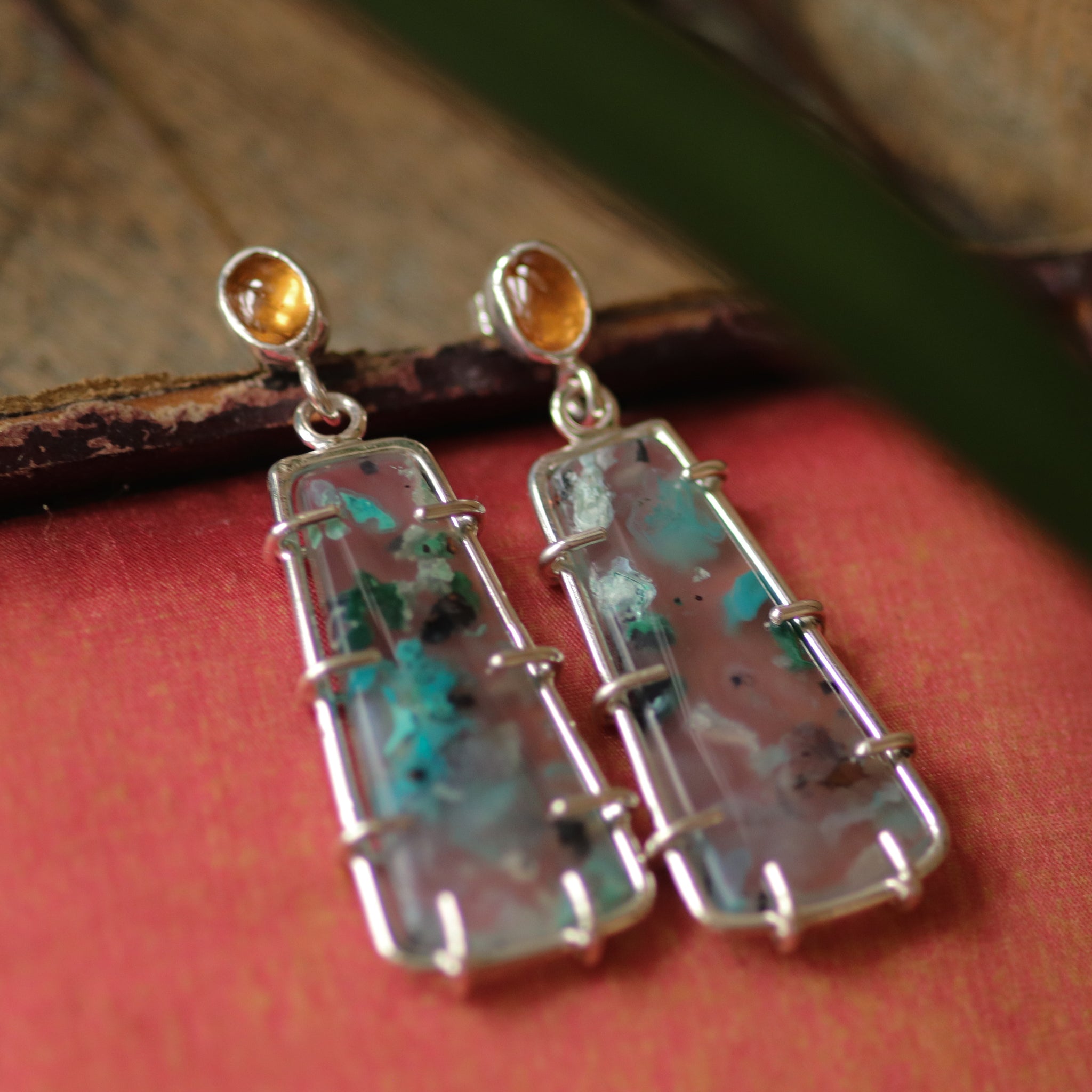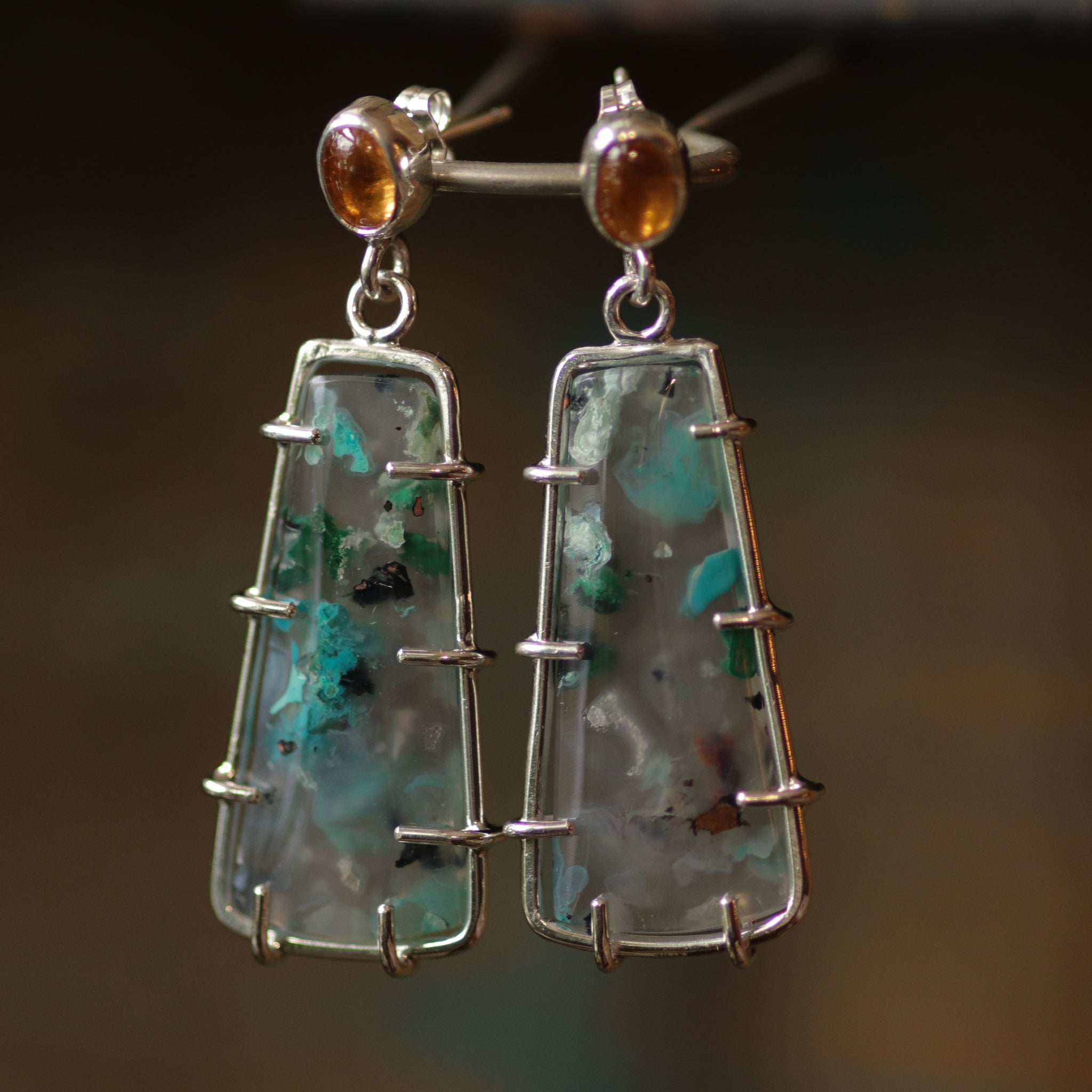 Yellow-orange Tanzanian Spessartine garnet with Beautiful top-grade Indonesian Chalcedony with Copper and Chrysocolla all in sterling silver.