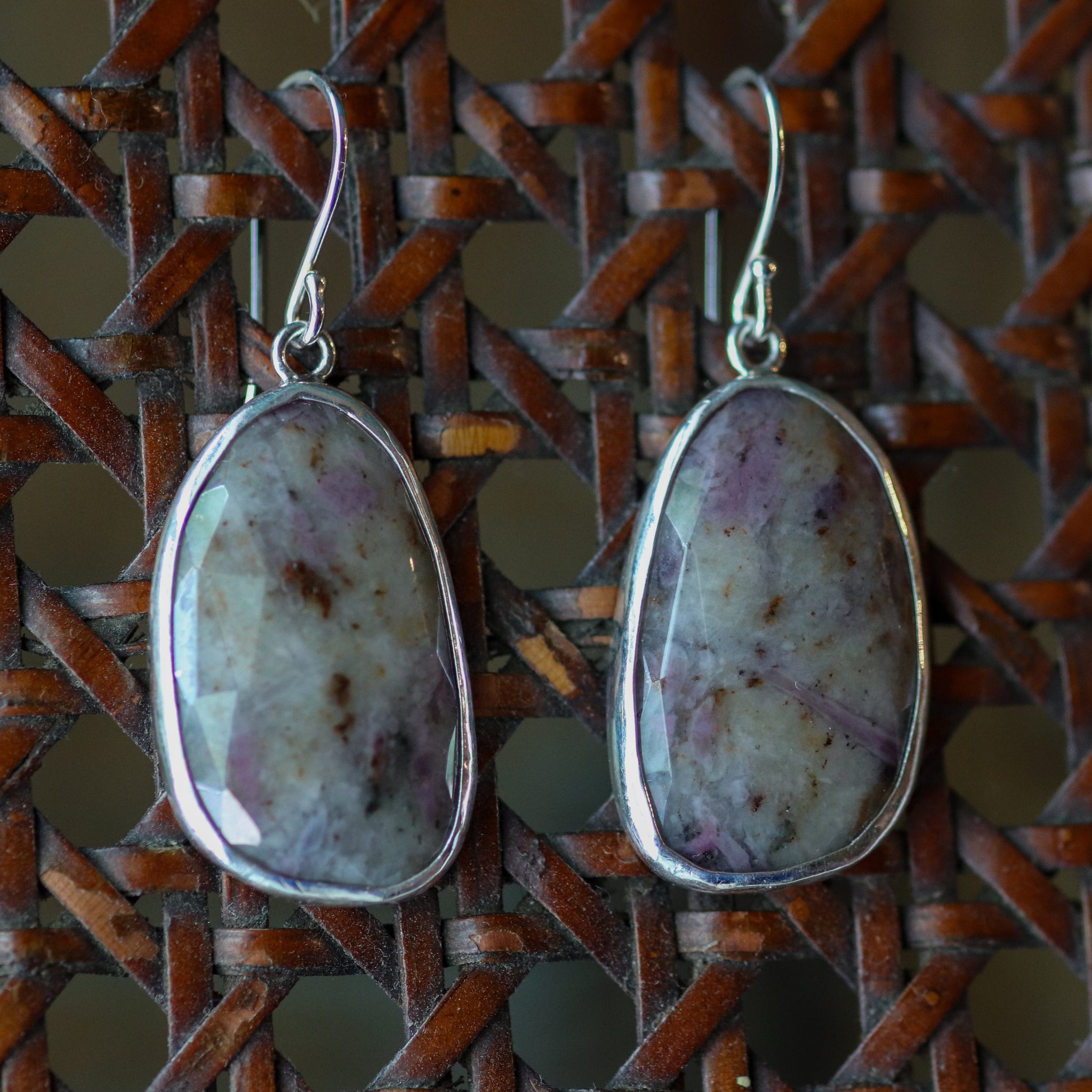 Stunning sterling silver dangle earrings, featuring Ruby in Quartz gemstones. Each earring showcases a unique natural pattern, where rich ruby hues are beautifully embedded within translucent quartz like a tropical sunset.