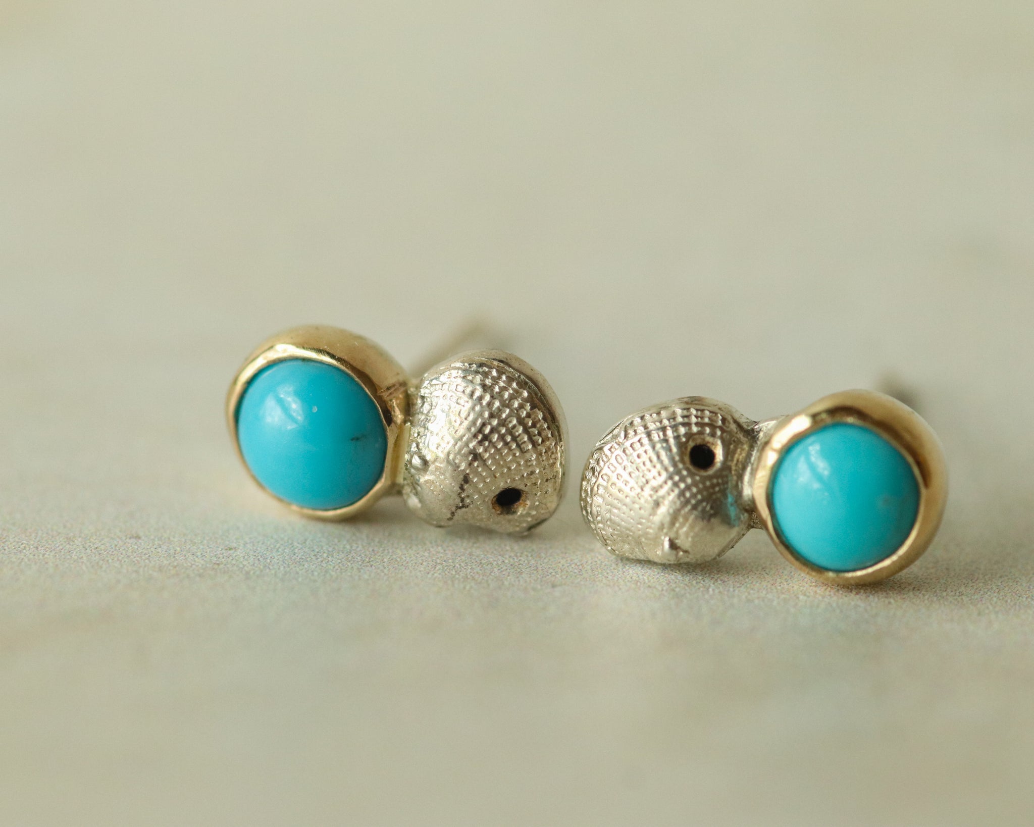 Dainty turquoise wrapped in 14k yellow gold with sterling silver shells.