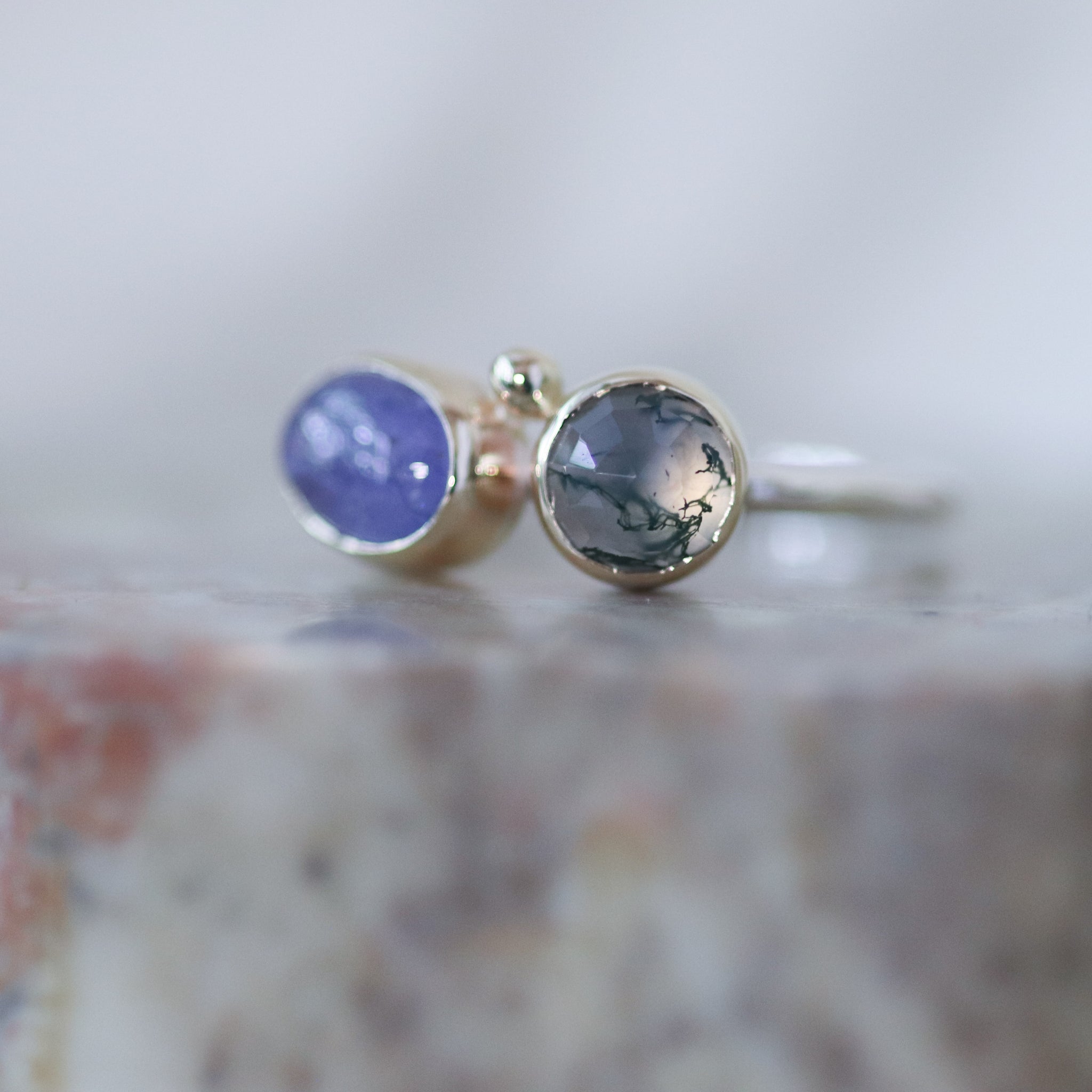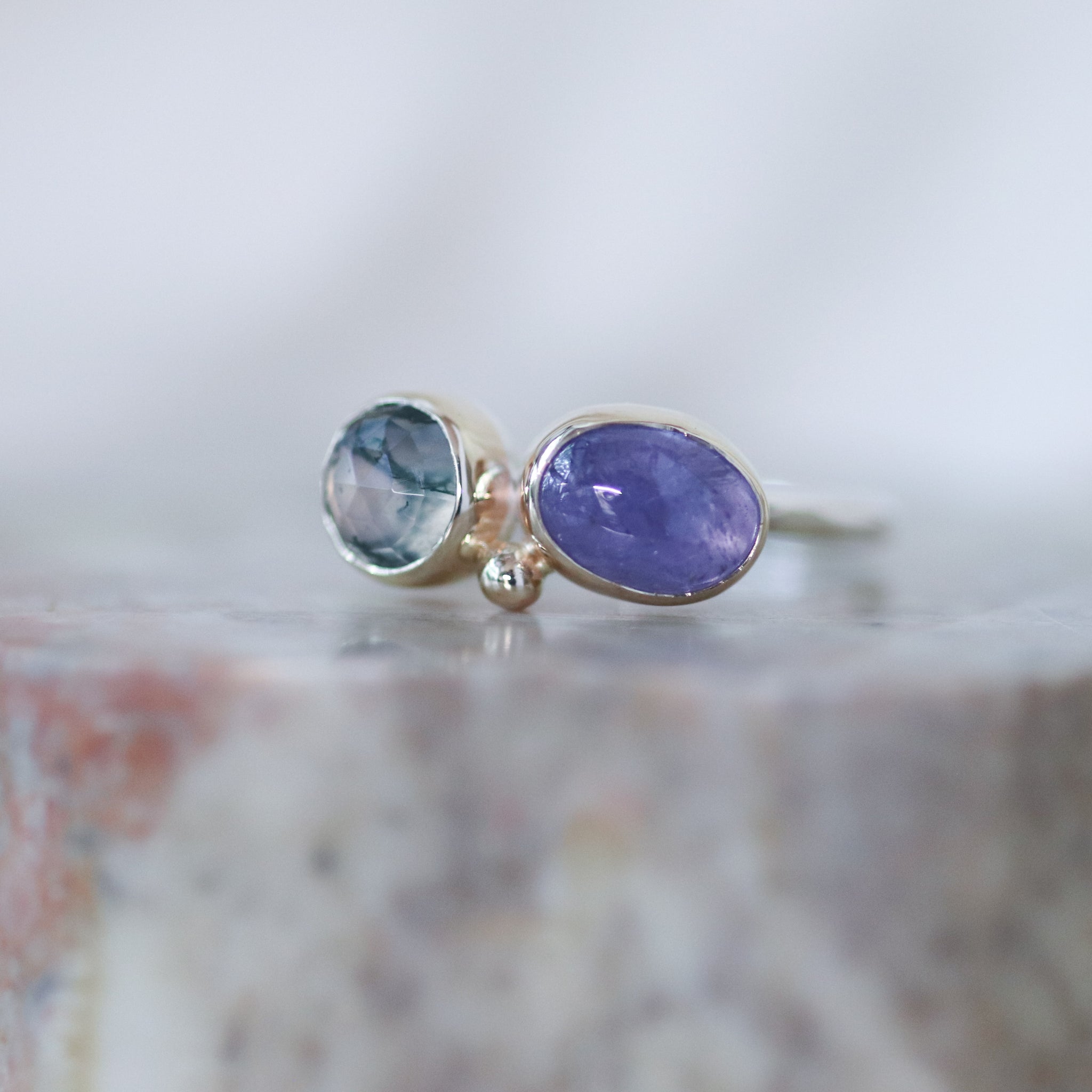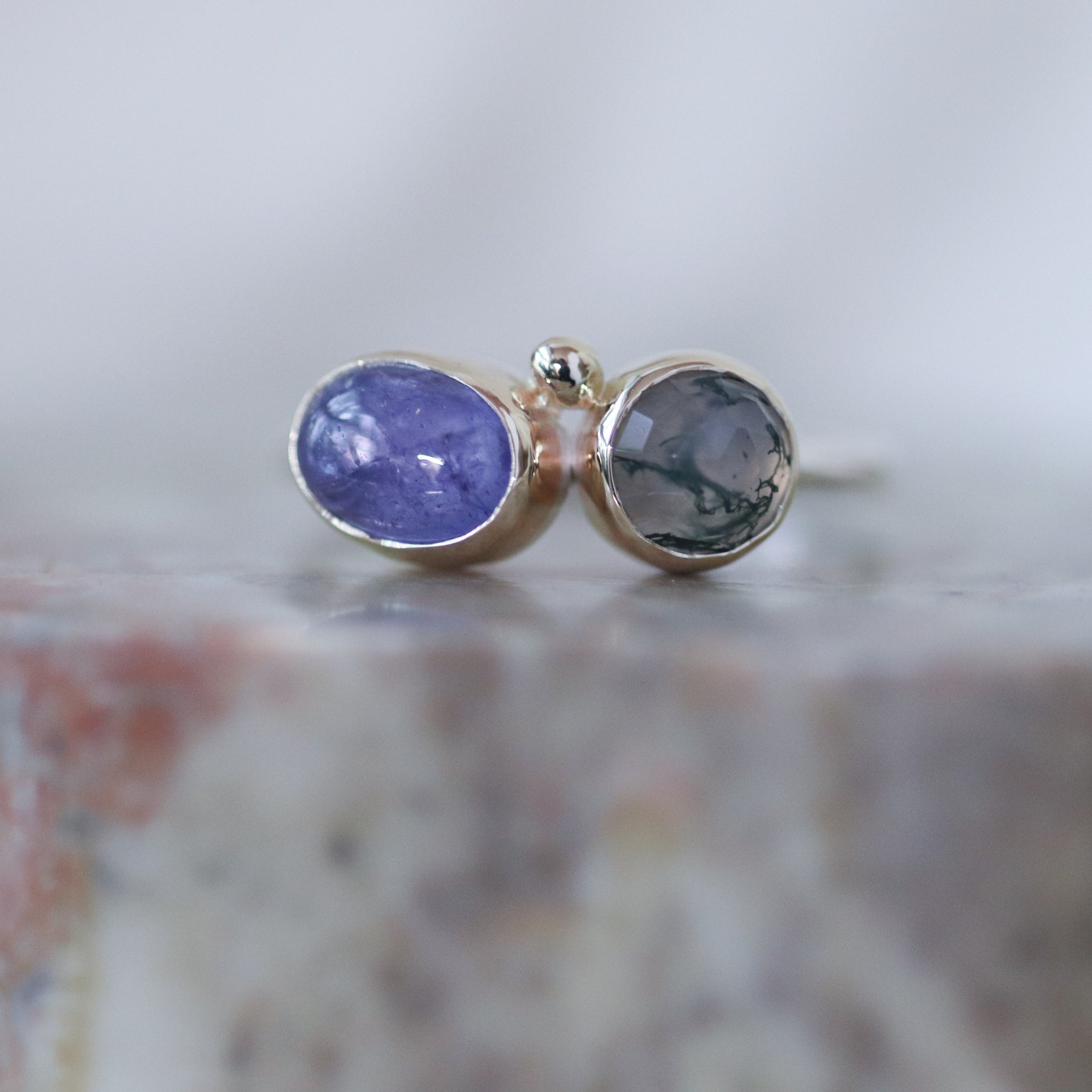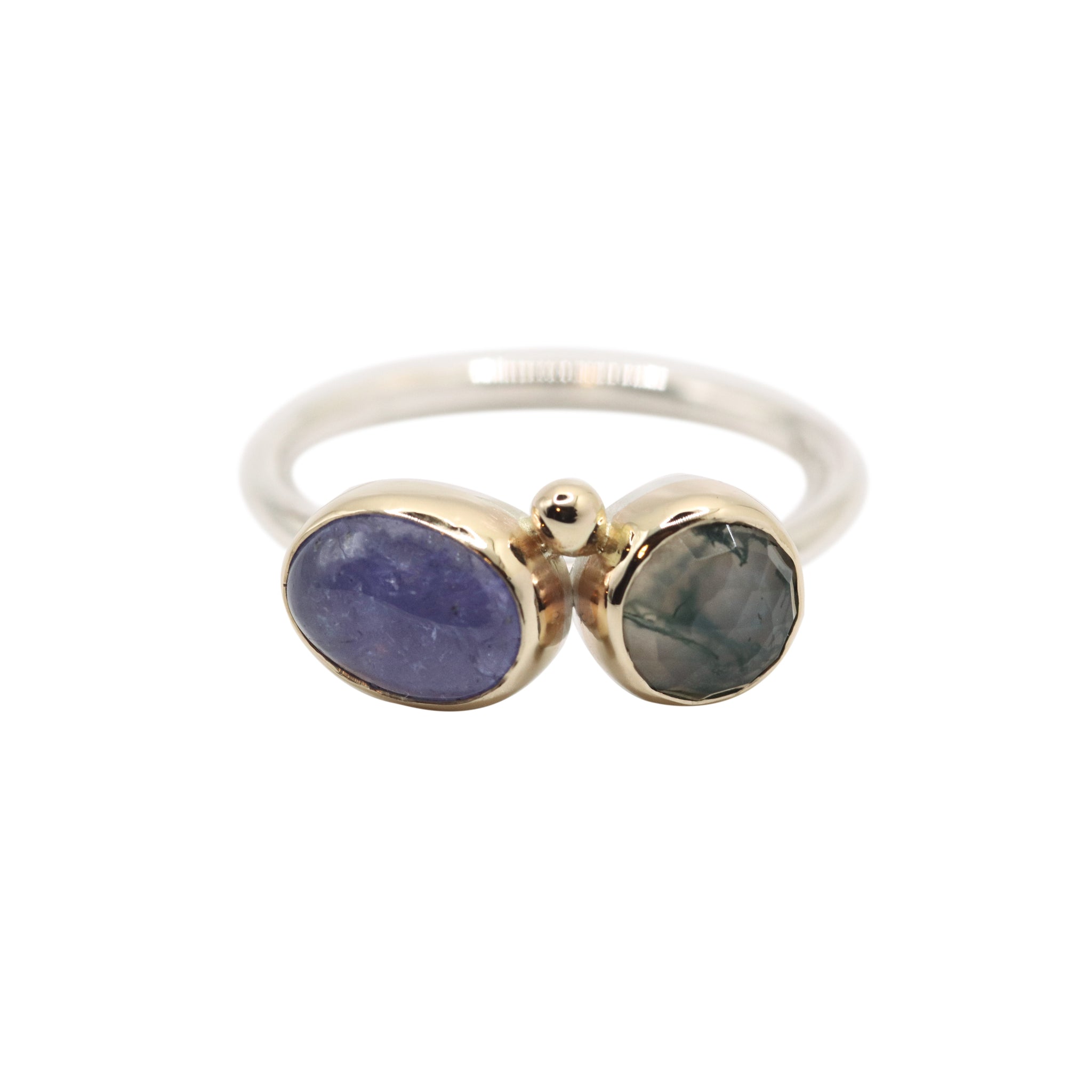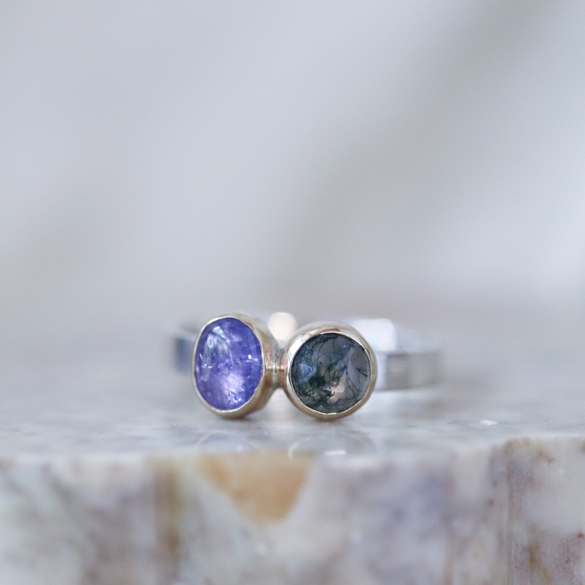 Stunning Twin Isle rng featuring periwinkle tanzanite and and green Moss gates wrapped in gold on Sterling silver.
